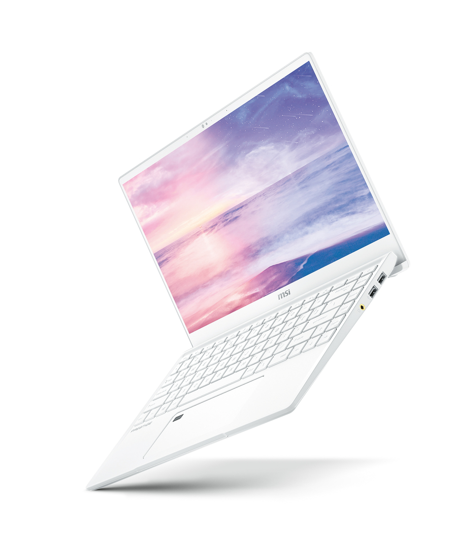 The design of the MSI Prestige 14 laptop is guided by modesty. It is kept in plain white, comes without decorative lines and features a matt texture that conveys a calm atmosphere. The intention is to avoid distracting creative users so they can give free rein to their creativity. When the laptop is unfolded, it is lifted by the protruding chassis cover at the rear, which tilts the keyboard by five degrees and reduces the strain on the wrists.