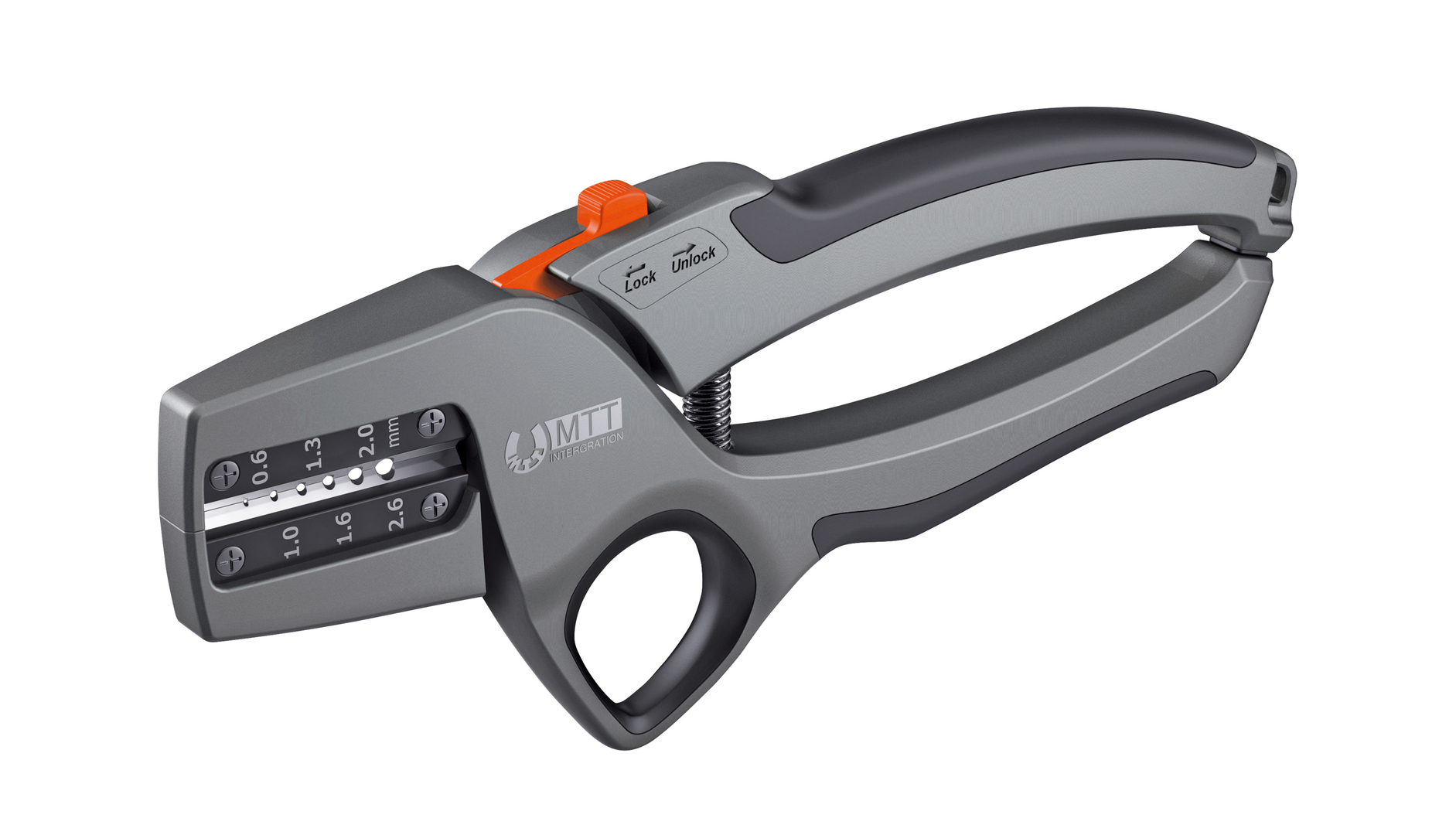 The MTT plastic wire stripper has been redesigned, with all of its metal components replaced by industrial plastics, which provides better electrical insulation properties. Also, plastic is easier to shape during the manufacturing process, which has made the size and the contours more user-friendly. The ergonomically shaped index finger ring enables better application of manual force and prevents slipping. The blades are moreover easy to replace.