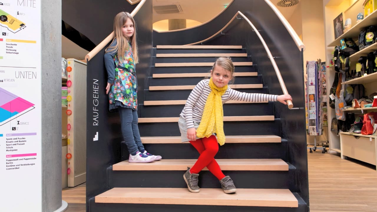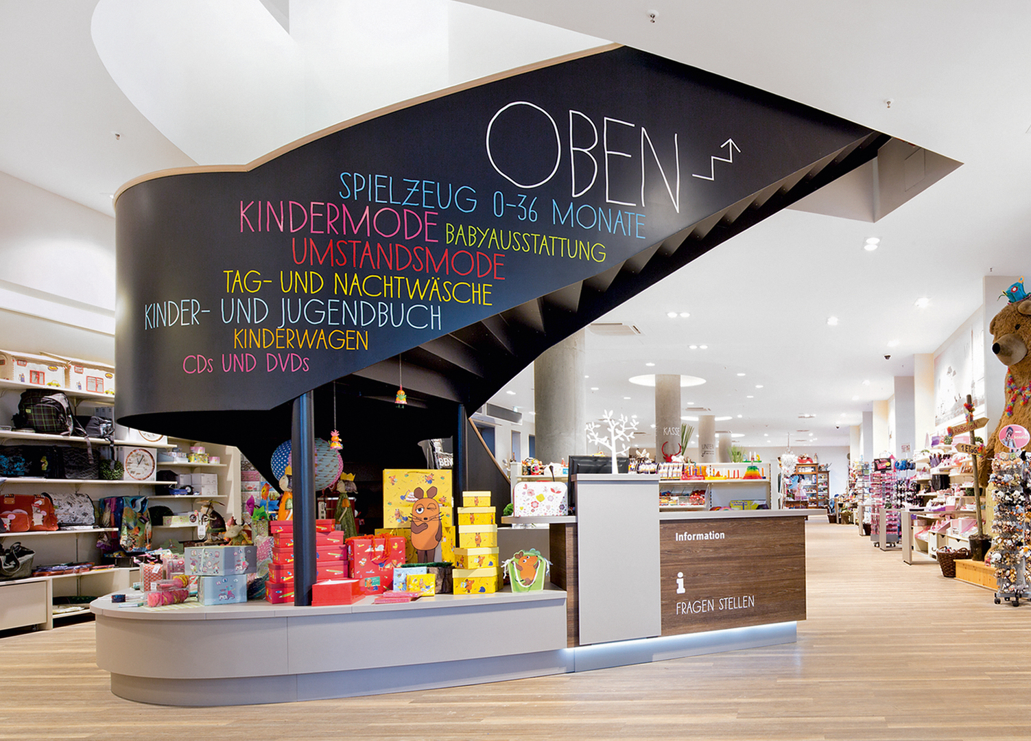 Designed with child-appropriate wording, well-coordinated colouring and simplified information icons, the guidance system for the MuKK children’s department store helps customers, especially children, find their way around the store quickly and easily. It takes into account their perceptual perspective while simultaneously providing parents with easy-to-grasp orientation at eye level. Consistently communicating on two levels, the colourful store guidance system encourages customers to discover the children’s department store in a playful way.