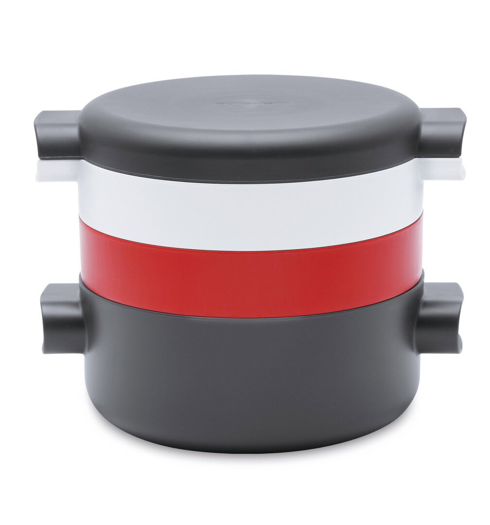 This versatile Multi Cooker was developed for the preparation of food in a microwave to achieve increased cooking comfort and efficiency. Thanks to its partitioning, it allows users to cook three dishes simultaneously. The lower part is suitable to make soups and stews, while the upper levels are intended for steaming fish or vegetables. The white and red compartments of the pot form a rich contrast to the black of its bottom and top.