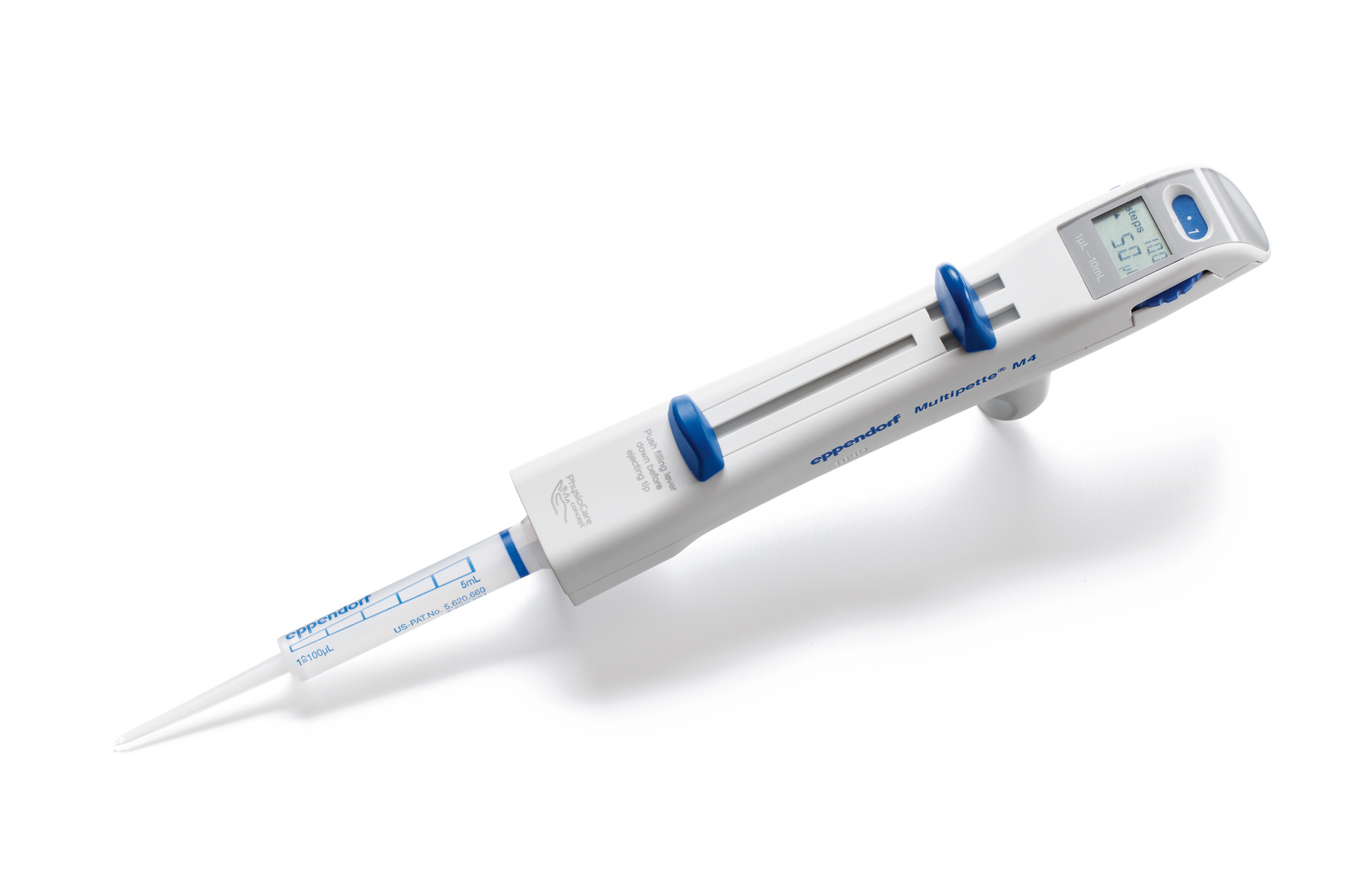 The Multipette M4 hand dispenser can repetitively dispense the aspirated liquid up to 100 times without refilling. With the integrated step counter, the dispensing procedure may be continued error-free even after an interruption. The emptied Combitip can be comfortably ejected by single hand control using the operating lever. An integrated sleep function turns the device off when not in use, thus reducing energy consumption and saving batteries.