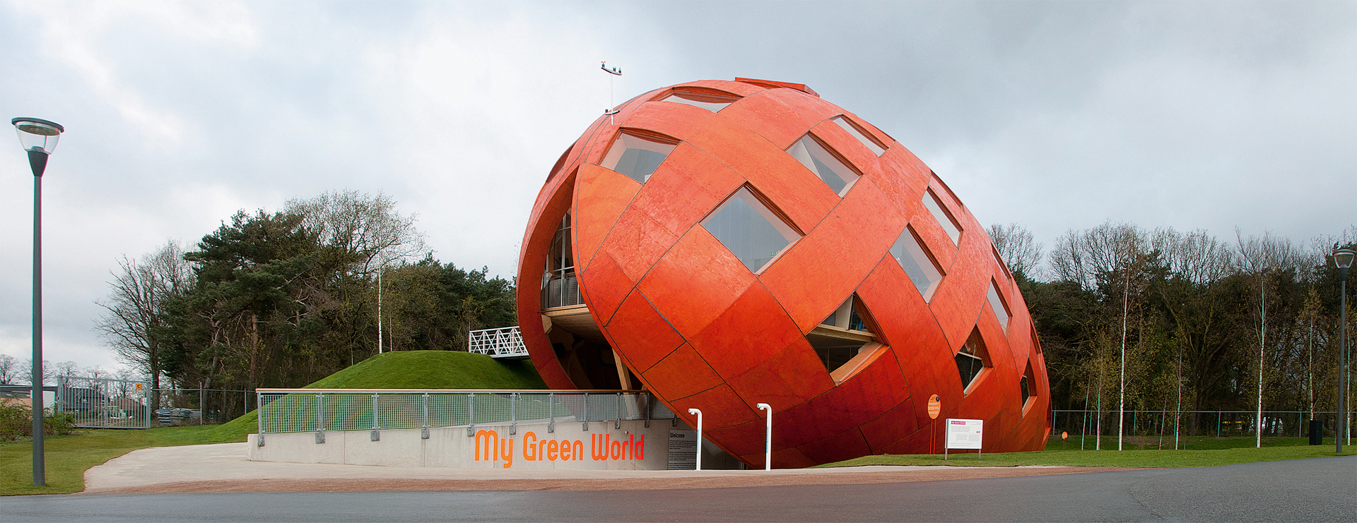 My Green World, the Dutch Pavilion at the Floriade 2012 – World Horticultural Expo, takes visitors on an inspiring journey of discovery through new developments and innovations. The exhibits My Green Life, My Green Lab and My Green City are partially supported by games and animations to lend them a futuristic and sometimes experimental appeal. The sustainable building is designed as a self-carrying shield made of wood with a form inspired by an opening seed. My Green World aims to demonstrate how advanced agricultural technology changes the word.
