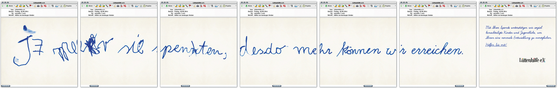 Supporting children from socially vulnerable families, the non-profit organisation Lüttenhilfe e.V. for instance offers them free private homework tutoring. This surprising e-mail has been designed to convince former supporters of the organisation to donate again for this purpose. In the e-mail, recipients see a sentence written by a child with many spelling mistakes, and how it gradually improves as the recipient reads through the handwritten text. The idea behind the e-mail is to communicate how both the orthography and the handwriting of children can improve – progress that is rendered possible thanks to donations.