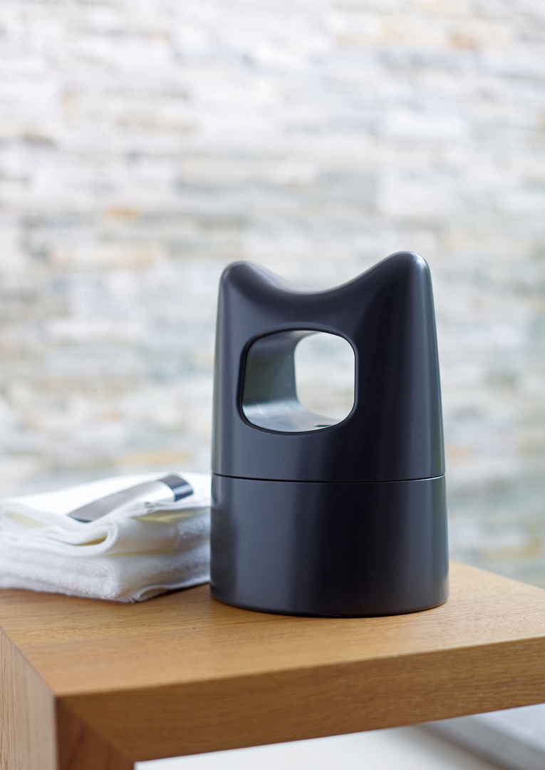 The Nahho flotation tub offers the relaxation of lying in a dugout. One can only be fully carried by the water and experience weightlessness, if one can stretch out completely. For this reason, Nahho has a special head rest: the optional, adjustable “Buschmann” neck support, modelled on a classical object from Ethiopia which was used to raise the head above the ground during sleep and that way be protected from insects. The modern, organically sweeping version of “Buschmann” gently supports the bather’s neck either above or just below the waterline. The pleasurable experience is rounded off by a specially developed sound module and soft, indirect lighting. To create a restful environment, the mixer fittings, waterfall spout or spotlights are hidden below the ledge cover.