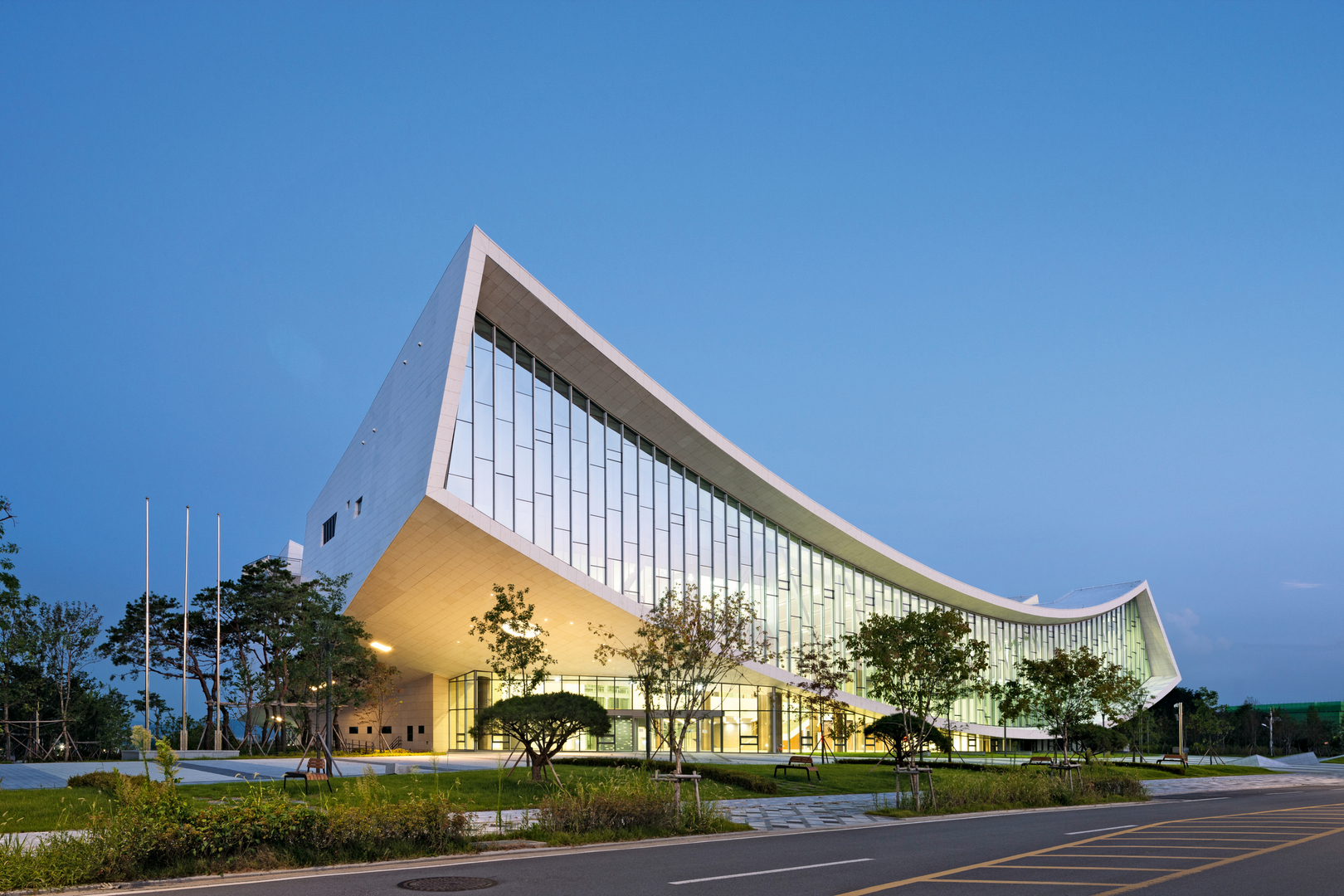 An alluring, dynamic use of form makes the National Library of Sejong City appear to float and gives it an inviting openness.