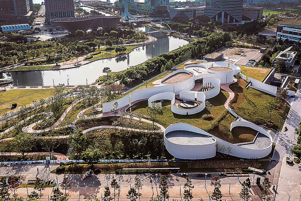 In keeping with Songdo Park’s relaxingtone, the museum design follows the park’s natural curves. The final layout resembles a child’s abstract scribbles, creating a fluid transition and organic visitor flow from the flexible, open promenade into the museum and its curved exhibition areas. The museum records the stories that flow through and becomes an integral part of the park’s experience.
