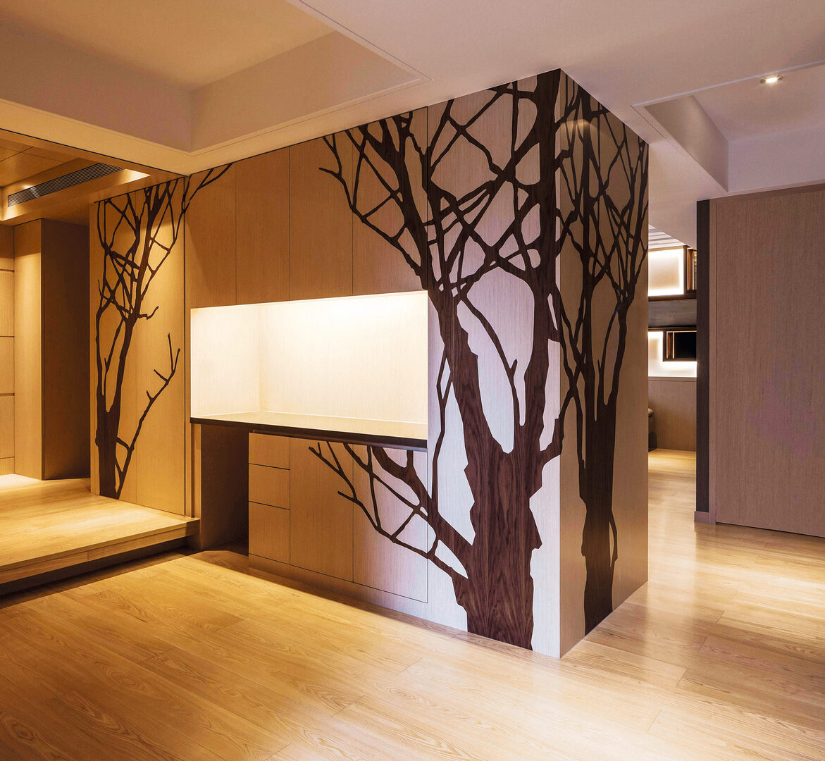 This residential house is set in a landscape of lakes and radiates purism and naturalness. The calm colour of the interior picks up on the beauty of nature and thus reflects it. The distinctive design feature of this house is the use of two different types of wood. White oak provides the dominant background of the corridor while walnut inlays, produced with the help of laser technology, provide attention-grabbing eye-catchers. They take the form of trees and exude a forest atmosphere.