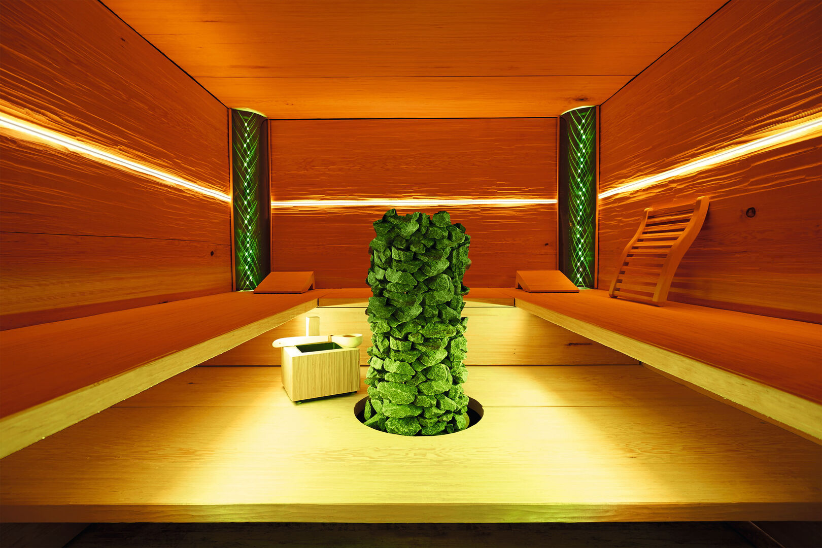 The Natural Touch sauna features the basic form of a cube. The construction consists of hand-scraped hemlock. This shaping technique results in different heights and depths which provide an appealing look and feel and an expressive aesthetics. A white circular light bar harmonising with green corner lights creates a harmonious lighting concept. The crossing light points produce a three-dimensional pattern. At the centre is a classic Finnish sauna stove that is composed of supposedly unstably stacked stones setting an unexpected visual accent.