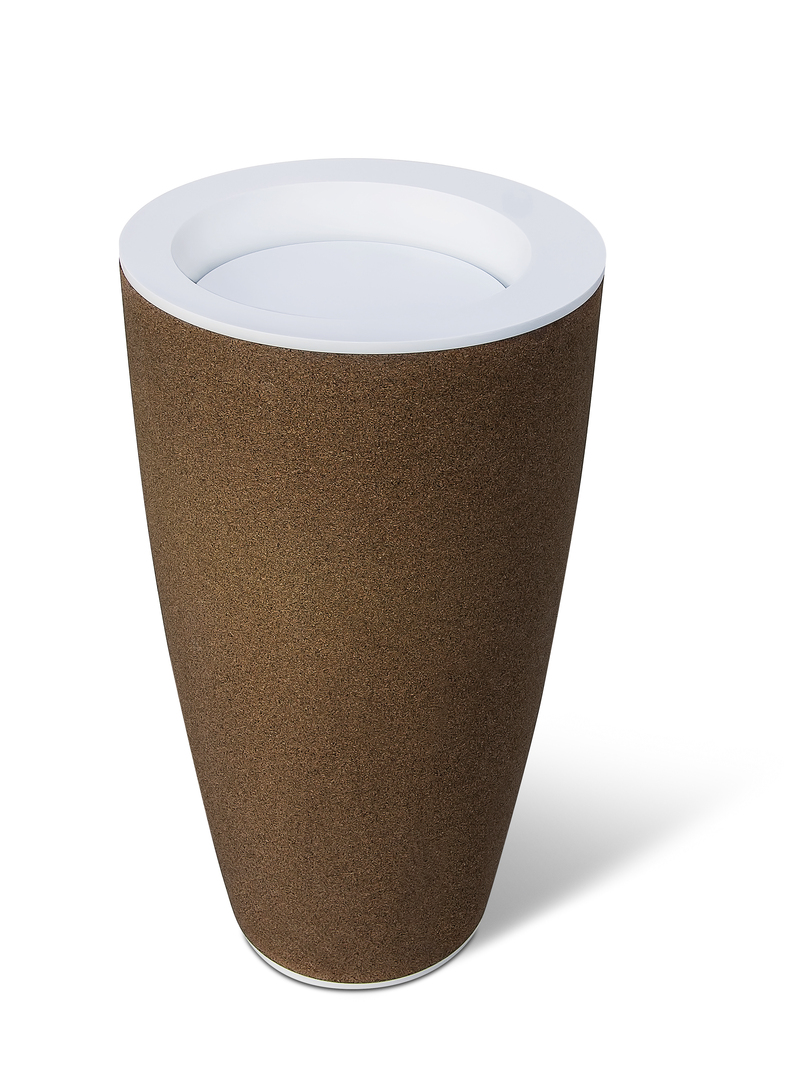 The washbasin Nature has the shape of a column and combines two materials. The washbasin with an unobtrusive drain at the inner edge is made of the solid surface material Corian, which has antibacterial properties and is easy to clean. The natural cork material of the column is humidity-resistant and air-impermeable. The whole column is lightweight; nevertheless, it allows for very good thermal and acoustic insulation. It can be installed in one piece.