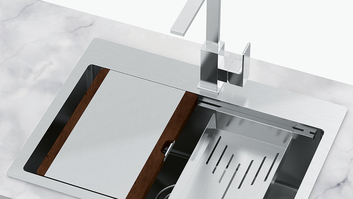 The sink raises the hygienic preparation of food products to a new level with its ultrasonic cleaner, which is integrated elegantly into the stainless-steel bowl.