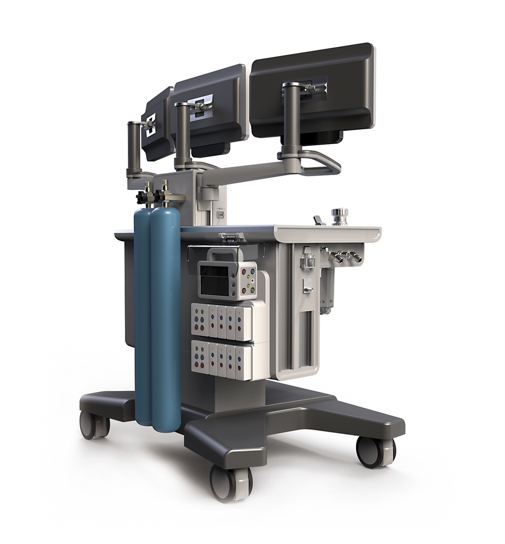 The Navigator3.0 is a specially designed moveable workstation for medical anaesthesia administration. The modular design allows for flexibility. The standing workstation includes additions like monitor screens for monitoring patient vital stats, medical processing units and other medical devices for administering anaesthesia. The movable station can also be attached to oxygen cylinders and devices to administer intravenous medication and anaesthesia. The stainless steel design makes it safe and sanitary for medical use.