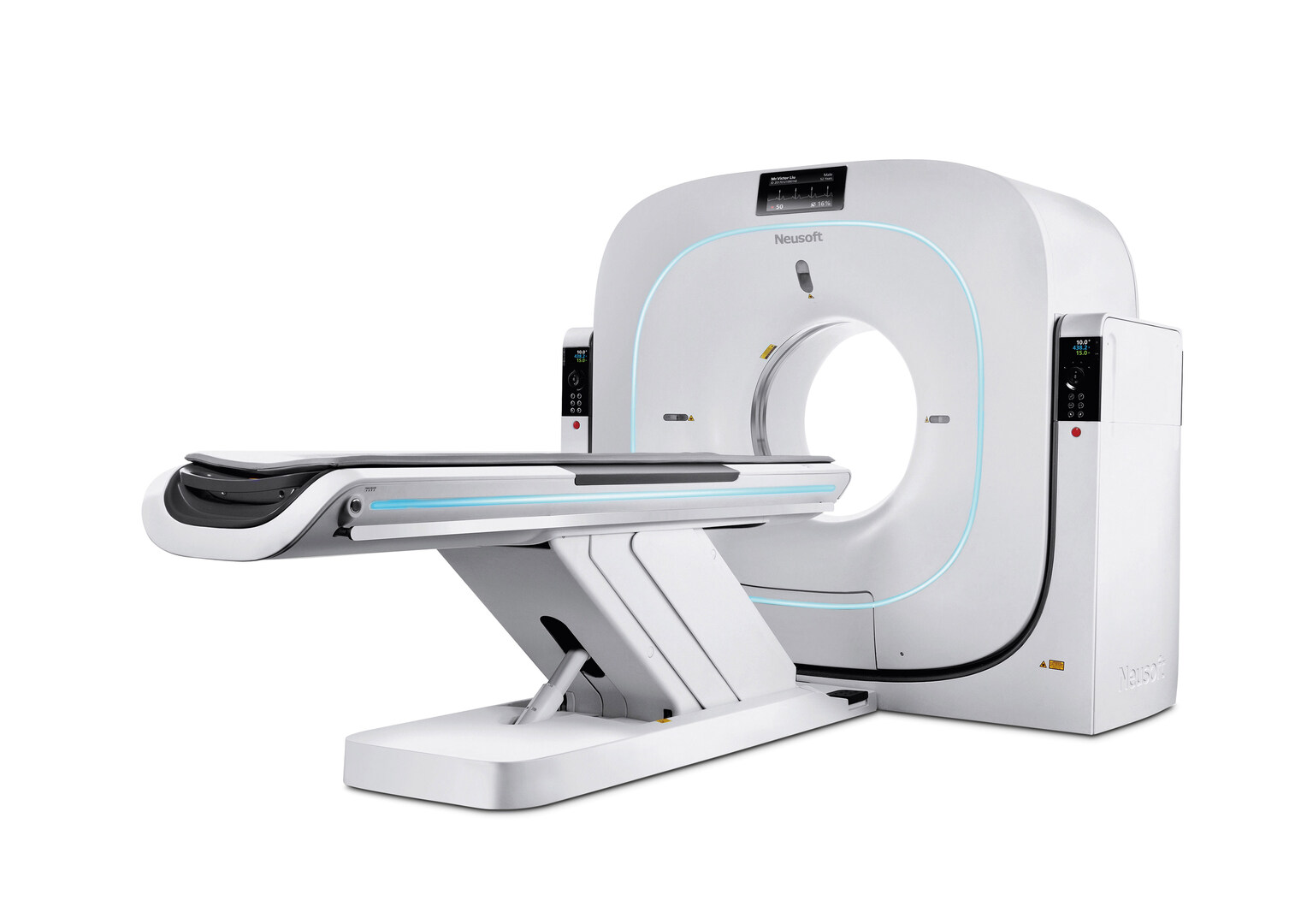The 128-slice computed tomography scanner called NeuViz128 CT provides precise diagnostic imaging data at low radiation doses. An illuminated ring at the gantry opening uses changes in colour to indicate which scanning phase is currently running. This keeps patients informed and reduces anxiety. Furthermore, patients are distracted from the examination by entertaining graphics. The control panels are emphasised using strong black-and-white contrasts. The control unit is dominated by an oversized rotary knob, which simplifies operation of the device.