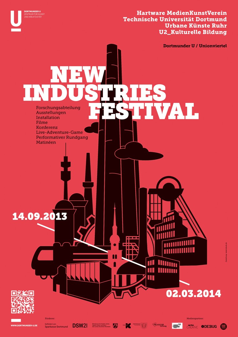 The choice of colours turns the posters for the New Industries Festival into a highly effective and also harmonious series. Together with the distinctive typography and the black motifs at the centre made of graphically reduced elements from both the historic and modern world of work, they emerge as recognisable eye-catchers.