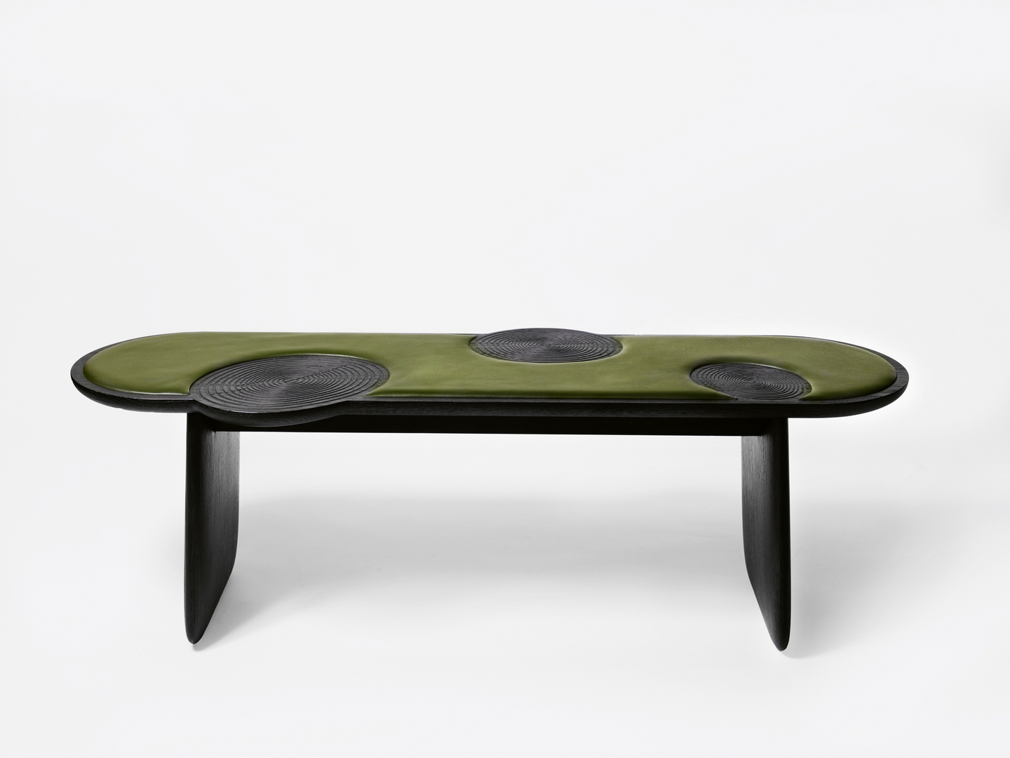 True to its name, the Nianlun Bench exudes a natural charm. The Chinese term for “annual ring” has been translated into a black wooden structure with a green seat cushion featuring cut-outs in the shape of tree discs. The pattern is carved with the five-axis carving process to resemble the annual rings of trees with uncanny realism. The discs also protrude slightly beyond the contour of the bench, serving as a practical surface for holding items.