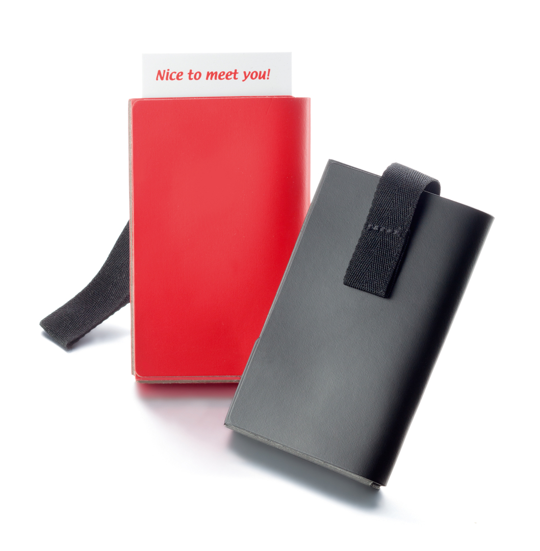 The edge of one side is rounded, the other angular. Overall, this business-card sheath made of recycled leather is unobtrusive yet stands out due to its fine asymmetry. When the user pulls the strap of the holder, a card slides out on which a friendly greeting is printed. Alternatively, business cards displaying the company logo may be carried in this case.