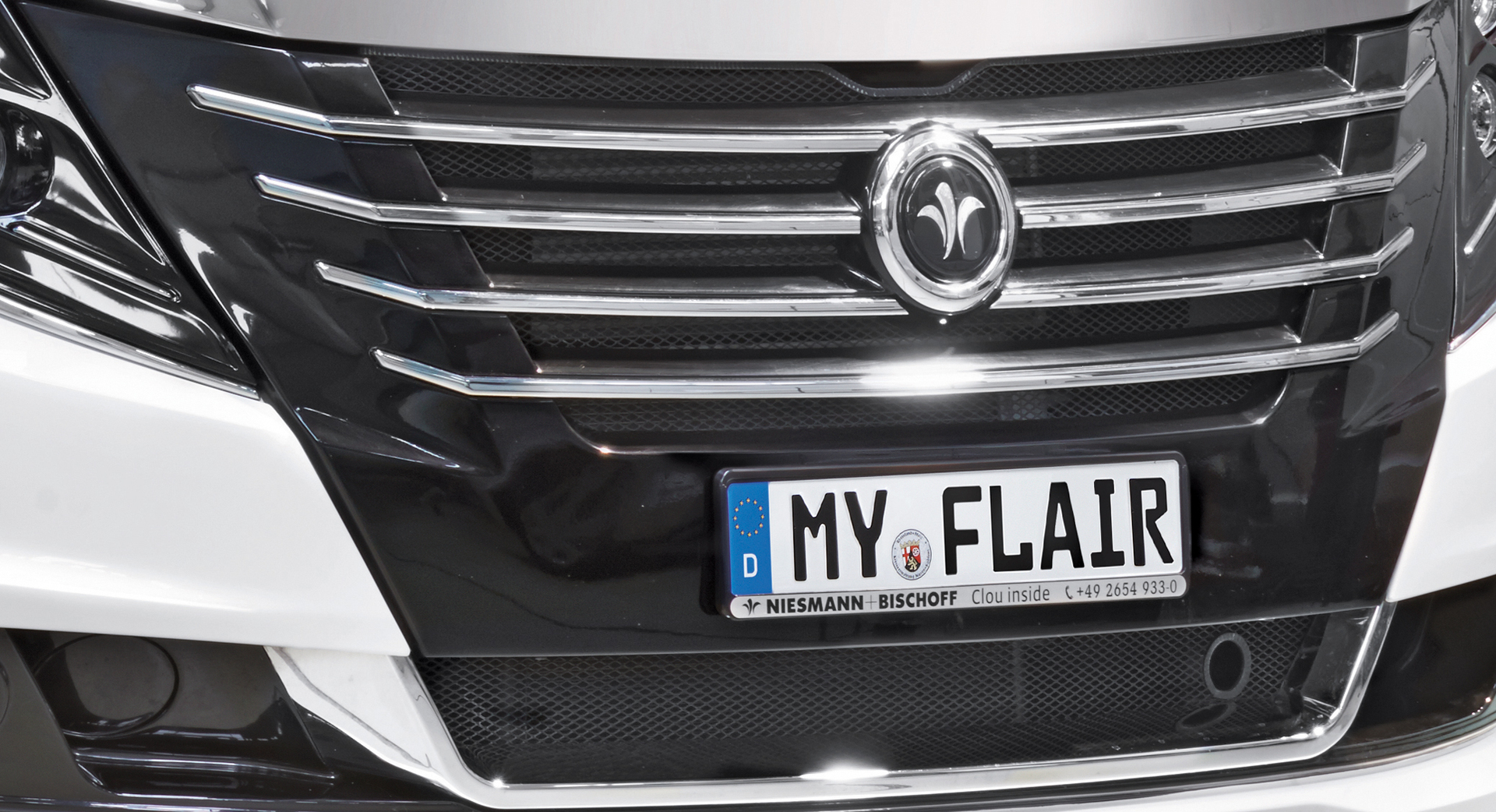 The Flair 2015 convinces with an enclosed unit of front, sides and rear sections, reminiscent of a car. Horizontal light lines lend structure to the sides of the vehicle, the convex-concave lines continue in the front and rear sections. The rear view camera is located behind the brand logo and thus protected from dirt. Fully insulated chassis hatches are integrated in the sides and can be operated with one hand.