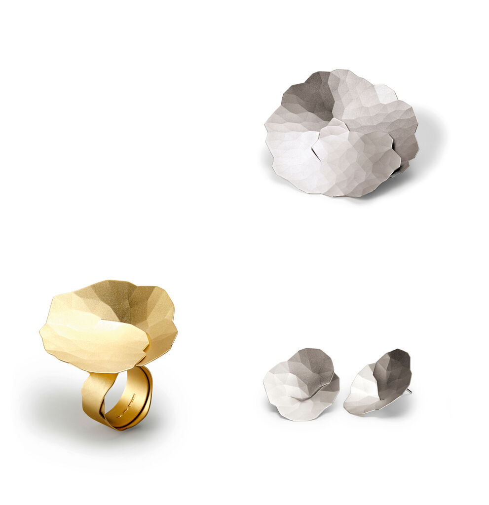 The use of an innovative laser process has allowed Niessing to create pieces of jewellery of fascinating beauty. The finest of lines, engraved on thin gold and platinum sheets, compose subtle shapes that are folded following the principles of origami. This gives the precious metals a gentle texture. Traditional methods of craftsmanship are here combined with new technologies in a pioneering way.
