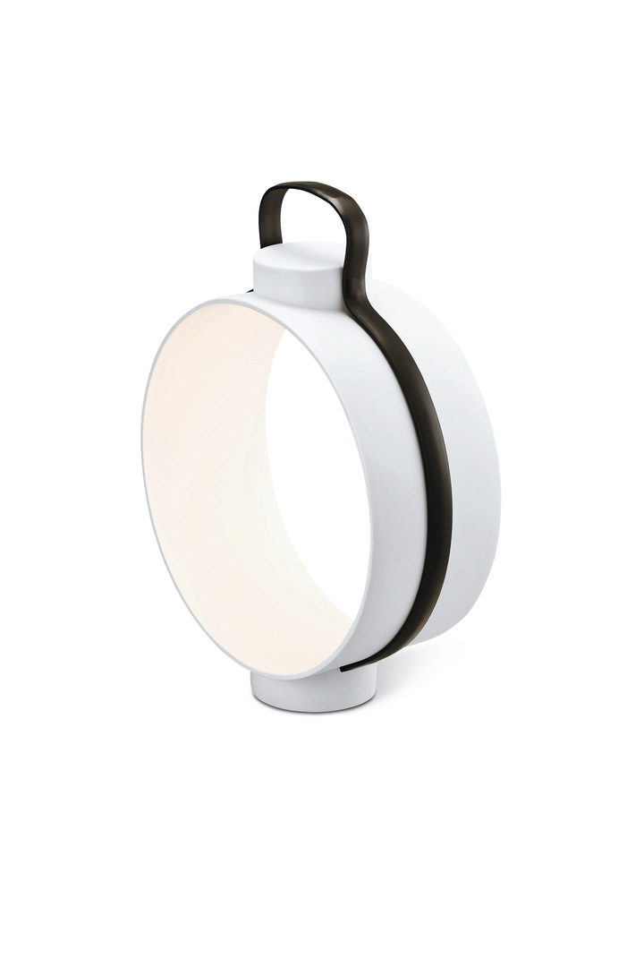 The Nightingale table lamp displays a creative structure: the light-reflecting lampshade is rotated 90 degrees. The delicate porcelain body is initially reminiscent of an antique lantern, yet presents thoroughly modern aesthetics through its clear form language and the soft beam of the LED light. A leather band – available in Bordeaux, dark brown or natural – serves as a handle and elegantly conceals the wiring. Nightingale is produced in two different heights, 27 and 42 cm.