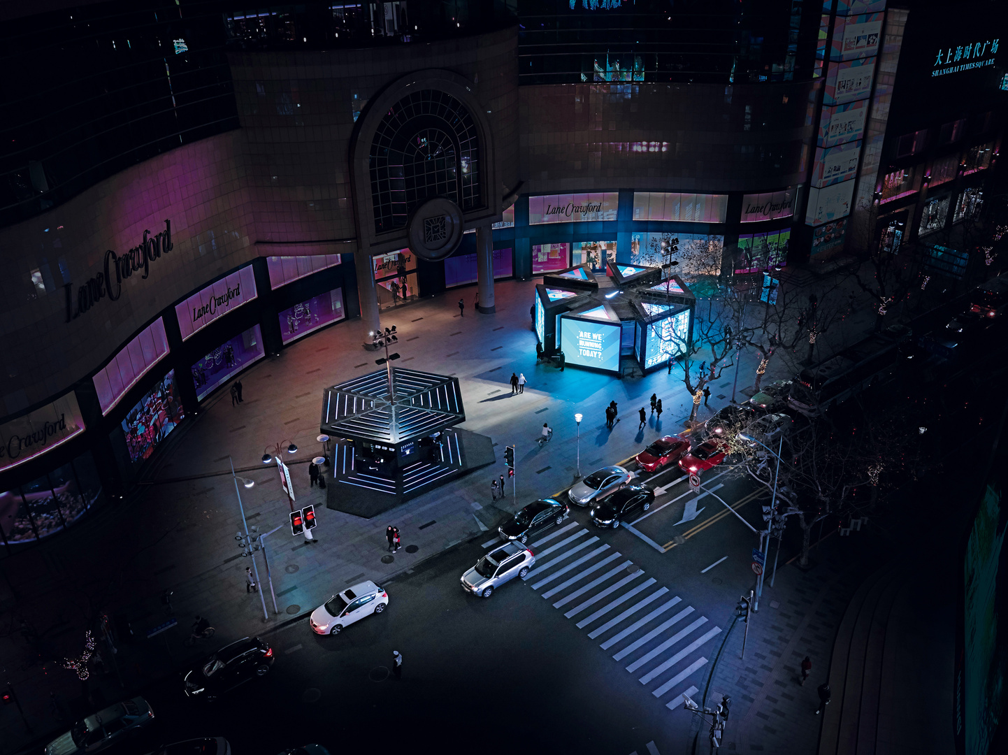 The pop-up gym in front of the Nike+ Run Club on the lively Huaihai Road in Shanghai, China, features a pair of stealth hubs with LED strips of light on the floor and the ceiling. The concept intends to build up “momentum” as runners prepare for their workout. Dynamic media surfaces are used throughout the kaleidoscopic interior and exterior, aimed at wrapping participants in a temple-like setting devoted to the running experience. As people gear up and begin to run, their live performance stats are displayed both to them and on the exterior of the hub, drawing the attention of the street’s heavy foot traffic.