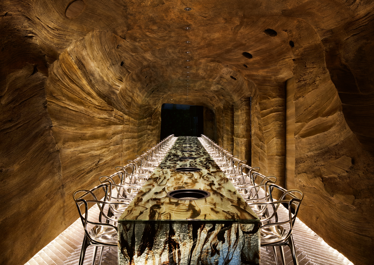 On two floors, this restaurant in Tokyo’s fashionable Roppongi District sets out to provide an impressive dining experience. The aim is to reconnect visitors with nature by stimulating all of their senses. The first floor resembles a cave-like setting with walls that have been conceived to look like a real cave wall. A herringbone glass floor represents the flowing of water, while the gravel made of glass under the table conveys the feel of really sitting near a river. The second floor features earth and greenery, surrounding the visitors with trees made of steel pipes. These pipes also serve as hangers for jackets or bags, which effectively make them appear like flowers in vibrant colours.