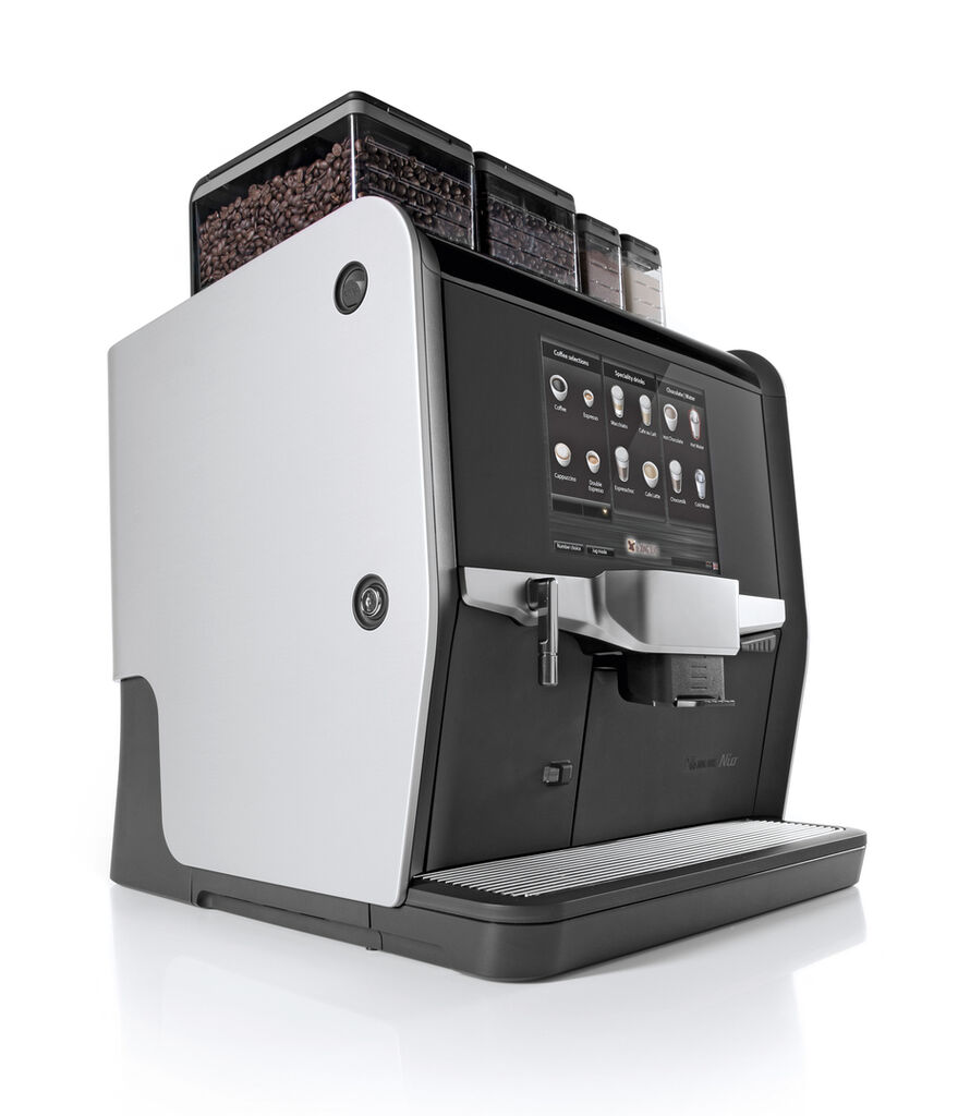 Nio is a fully automatic coffee maker which was designed for use in office environments or for catering. Thanks to a keyless cleaning and operating function, filling, cleaning and emptying is easily possible from the outside, without the need to open the machine. The transparent containers for ingredients, accessible from the top, are a visible confirmation that each coffee specialty is made fresh, while at the same time facilitate easy filling. The coloured LEDs are not only lively but also support the easy use and operation of the Nio.