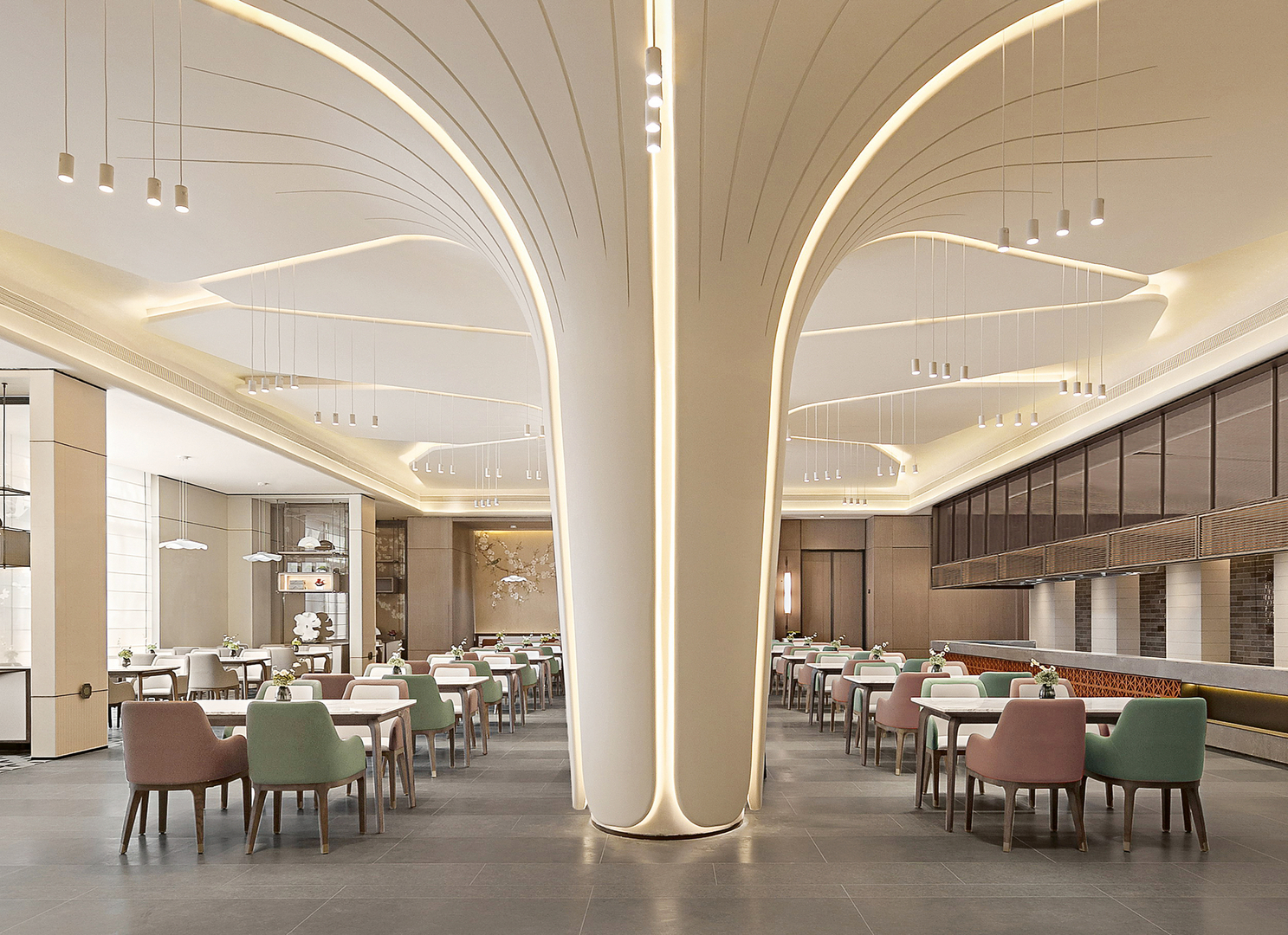 The design team at Noblesse IX drew inspiration from the cycle of seasons to create a comfortable environment for elderly people. The main theme is the plum blossom in its winter glory, which was translated into the bright lounge with imposing, illuminated columns. These transition smoothly into the ceiling with an elegant curve, reminiscent of a tree. Furthermore, the clear visual lines and restrained furnishings give Noblesse IX a calm atmosphere. The lift area in calm grey also embraces this stylish aesthetic.