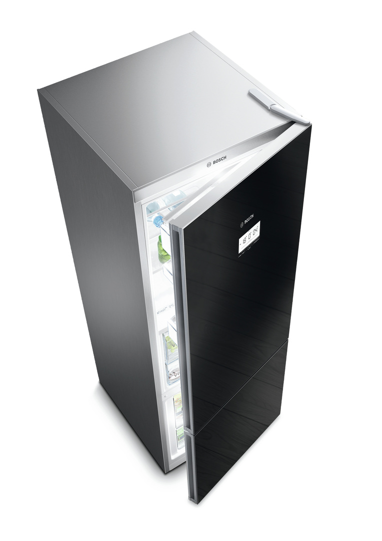 The exterior of this fridge-freezer is characterised by a high-quality, elegant black glass front which gives it a distinctive appearance. In the interior, a vertical light band illuminates the inside optimally. An additional spotlight in the ceiling beams at a display, by means of which the moisture in the “VitaFresh pro” compartment can be regulated. The “VitaFresh pro” compartment provides careful storage of food, for long-term retention of freshness and vitamins.