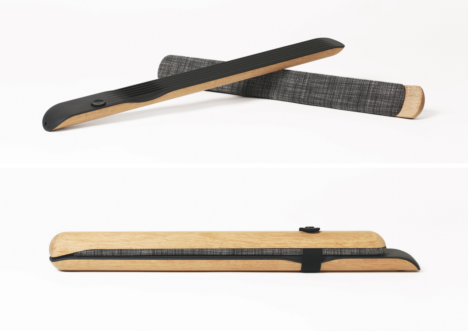 Technology is constantly changing the way we are living. Powerful mobile devices and widespread connectivity serve as fertile ground for a new generation of nomads. From urban work-from-anywhere lifestyle to digital nomads roaming the globe freely, new cultural movements are rising. We are more mindful of the objects we surround ourselves with, striving to travel light and collect experiences more than things – own less, explore more. NOMAD is a digital musical instrument born from the desire to create music on the go. It is designed to be thrown in a backpack to bring one’s musical creation to life, anytime and anywhere. The wooden neck creates a familiar feeling while the minimalistic form enables users to take their musical instrument anywhere they go. The pressure sensitive frets and flexible strings preserve a traditional playing experience, however, they will never break or get out of tune. NOMAD combines both the digital and the analogue – maintaining the familiarity of a classic guitar yet adding the possibilities hidden within a digital musical instrument. Paired with an app, NOMAD can play an endless variety of sounds and the frets can be turned off for “fretless mode”, while a digital capo controls the pitch of the strings. Create music wherever life takes you. Play music through headphones during quiet nights and busy subway rides or connect wirelessly to the portable amplifier to share musical creations with other people. Designed as a pair, the amplifier doubles as a case cover, protecting and complementing the instrument. Creating distinct areas of internal and external, low-tech and hi-tech, traditional and modern, NOMAD was designed to age with grace and just like traditional musical instruments, it becomes unique and deeply personalised over time. The user interface with its iconic flexible strings distils the essence of a musical instrument to its core and invites anyone to create music. Whether it is bringing people together, overcoming language and cultural barriers, or keeping musical creations private via personal headphones, NOMAD is a musical instrument that fits into any lifestyle.