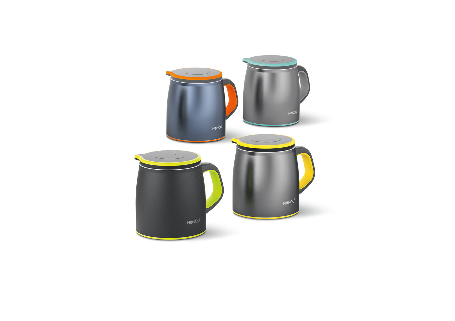 This vacuum mug series was designed as a lifestyle product which appeals to a young, trend-oriented target group. Available in a variety of colours, Nonoo offers buyers a myriad of choices. The handle and the edge of the lid are accentuated by bold colours, forming a rich contrast to the silk-matt stainless steel surfaces. The lid allows two different positions to control the intensity of the thermal insulation.