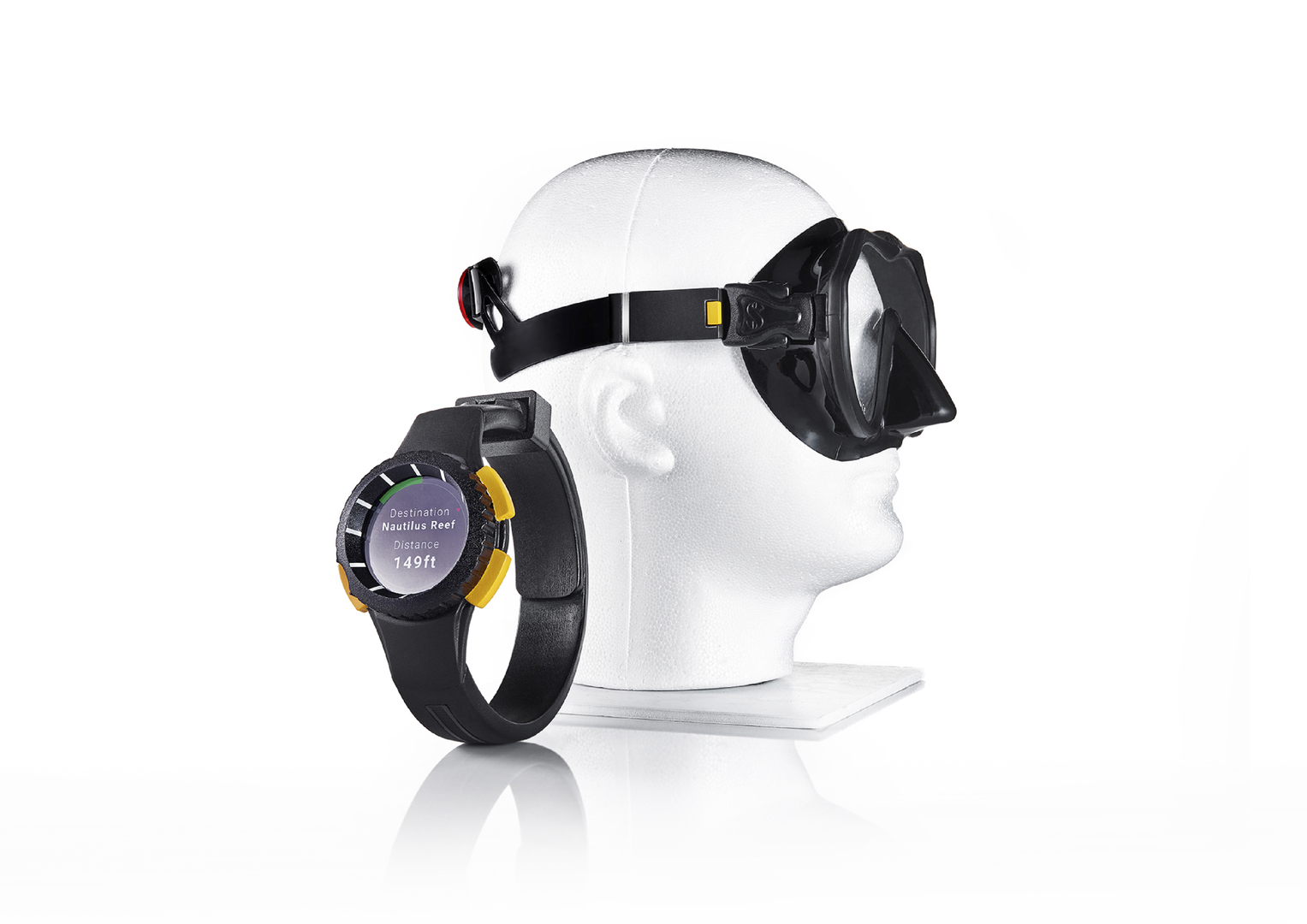 Goggle-mounted vibration sensors provide divers with directions by vibrating either on the left or right side to signal navigational turns. This allows divers to focus their attention on their surroundings, eliminating the need to refer to their watch screens constantly for directional bearings.