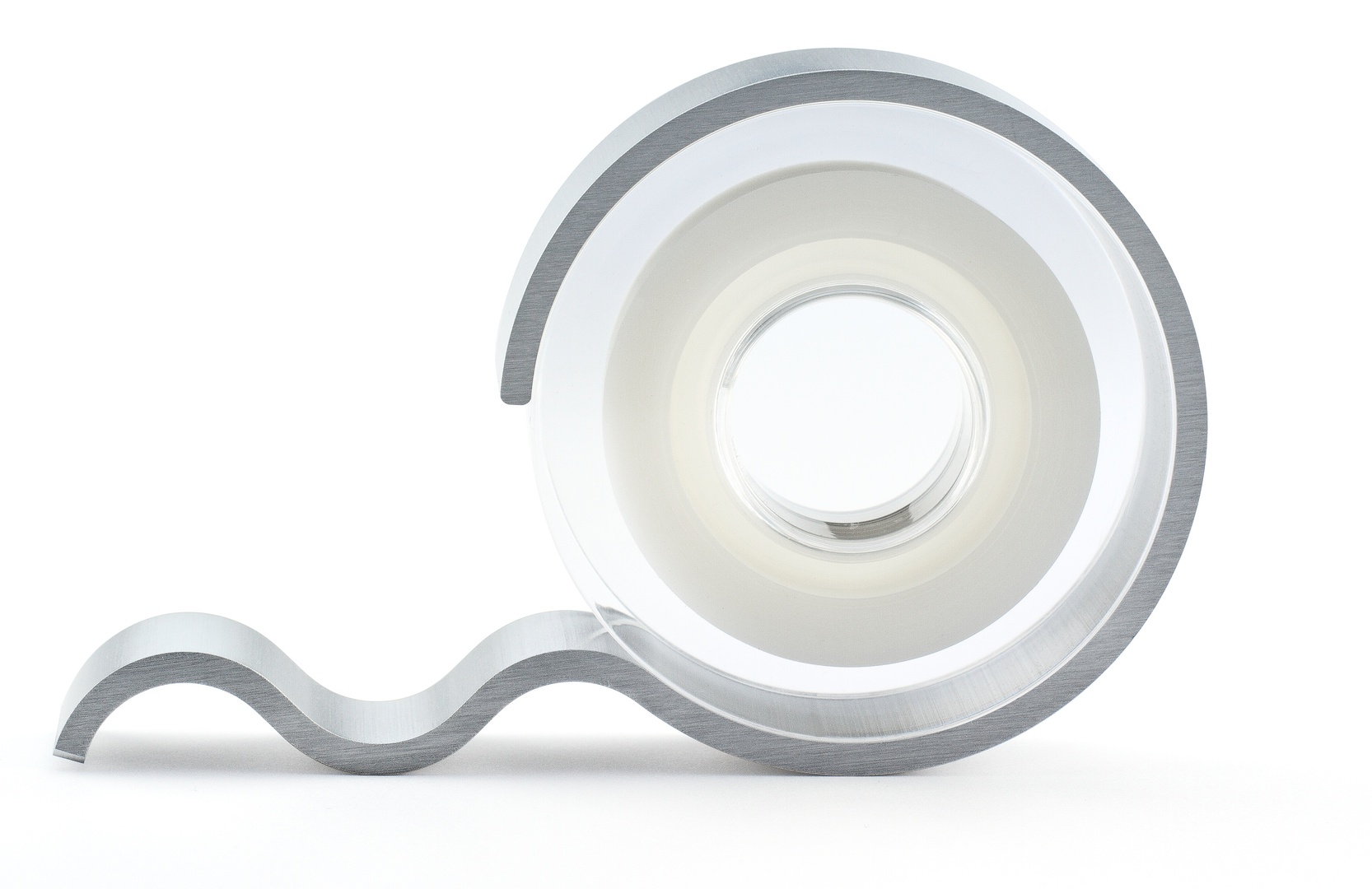 Being innovative means moving beyond old habits and inventing something new. The Notchless tape dispenser achieves this on the one hand with its unconventional design, which makes it recognisable as a dispenser for adhesive tape only upon second glance, and on the other hand through its functionality. Its structural design is reminiscent of a small snail carrying its house on its back, with the roll of tape floating apparently weightlessly inside. The roll is held in place by a clear module which can easily be removed when replacing the tape, and reloaded with new tape put back again. The particular functionality of the Notchless is that the blade for tearing off tape features an even cutting area. This not only increases safety, it also achieves edges that are no longer zig-zagged but straight as if cut with a pair of scissors. Notchless is made from aluminium that emphasises the aesthetic character of this practical tool.