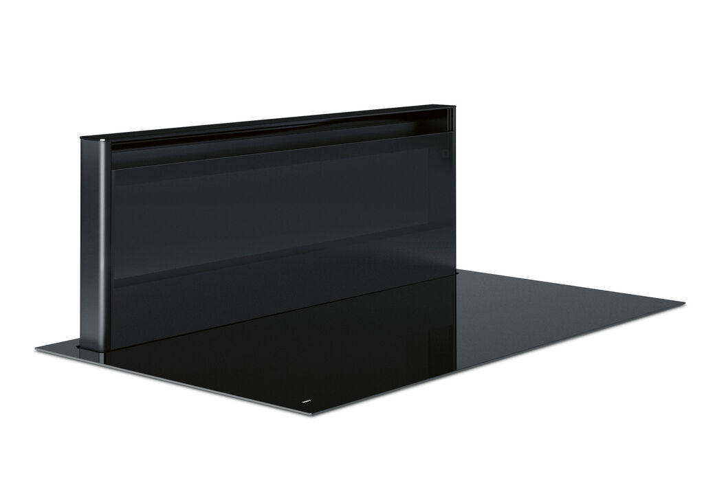 Novy Panorama combines an extendible vapour extractor with a high-quality cooktop. The glass-covered ventilation tower at the back of the cooking zone can be extended and facilitates particularly efficient and quiet extraction at the height of the pans. When the extractor is not in use, it disappears flush with the cooktop. Four adjacent octagonal induction cooking zones can be combined in pairs to obtain a larger cooking surface. The white slider control is activated as soon as a pan is placed on the cooktop.