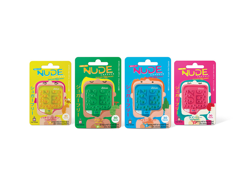 Nude Capsule is a four-layer mint flavour capsule, the outer layer of which melts in the mouth. The inner layer dissolves only in the stomach, creating the breath refreshment even further from inside the body. The packaging design consists of hand-drawn illustrations with bright colour schemes to represent freshness and confidence, while the package features a window in the shape of an opened mouth to make the capsule visible. The outer box is opened by pulling it to the back in order to display the items held inside on the shelf.
