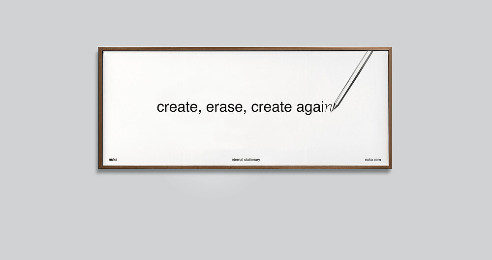 Nuka is a waterproof notebook with a matching metal pencil. As fully rewritable “eternal stationery”, the product appeals to the environmentally conscious costumer. The brand identity is kept minimalistic and utilitarian – one font and one doodle – so as not to distract consumers from their own ideas. Nuka simply provides the tool for users to tell their story. The handwritten font is both the message and the form.
