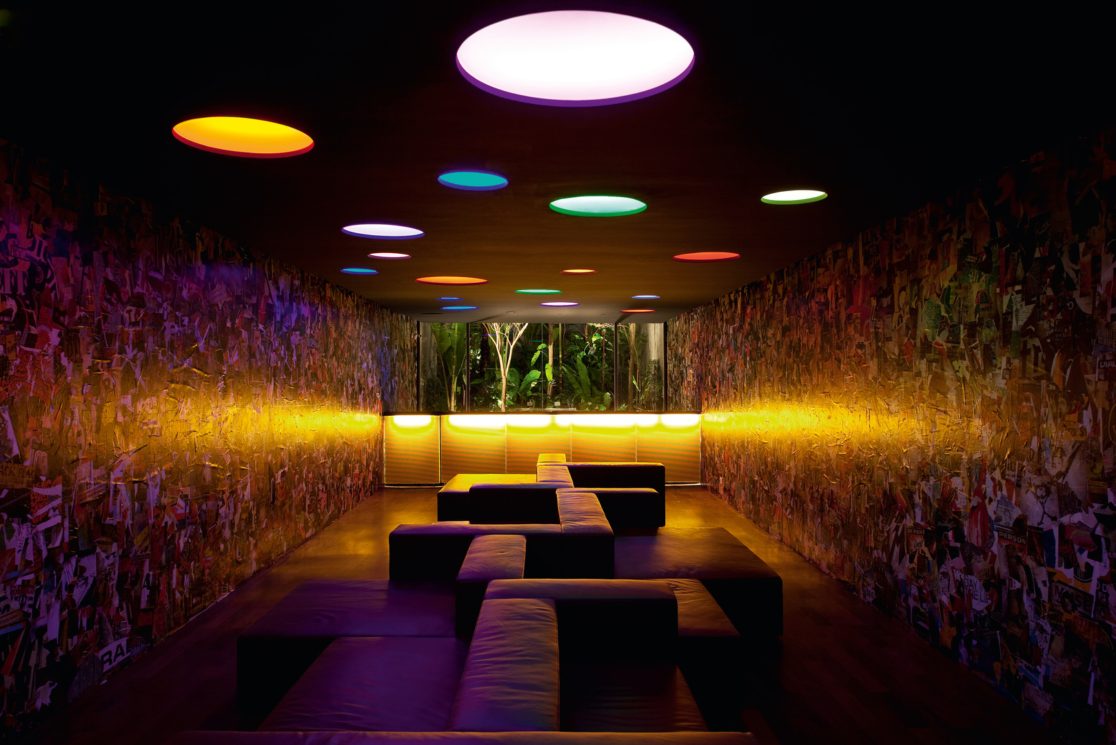 The Numero bar was built on a very narrow, long plot (5 x 61 metres) in São Paulo. Like a ramp, it extends from the street through a hallway to the cascade-shaped main hall and features two very distinct spaces on different levels – the bar lounge itself and the private lounge, both of which have a very comfortable and pleasant atmosphere.