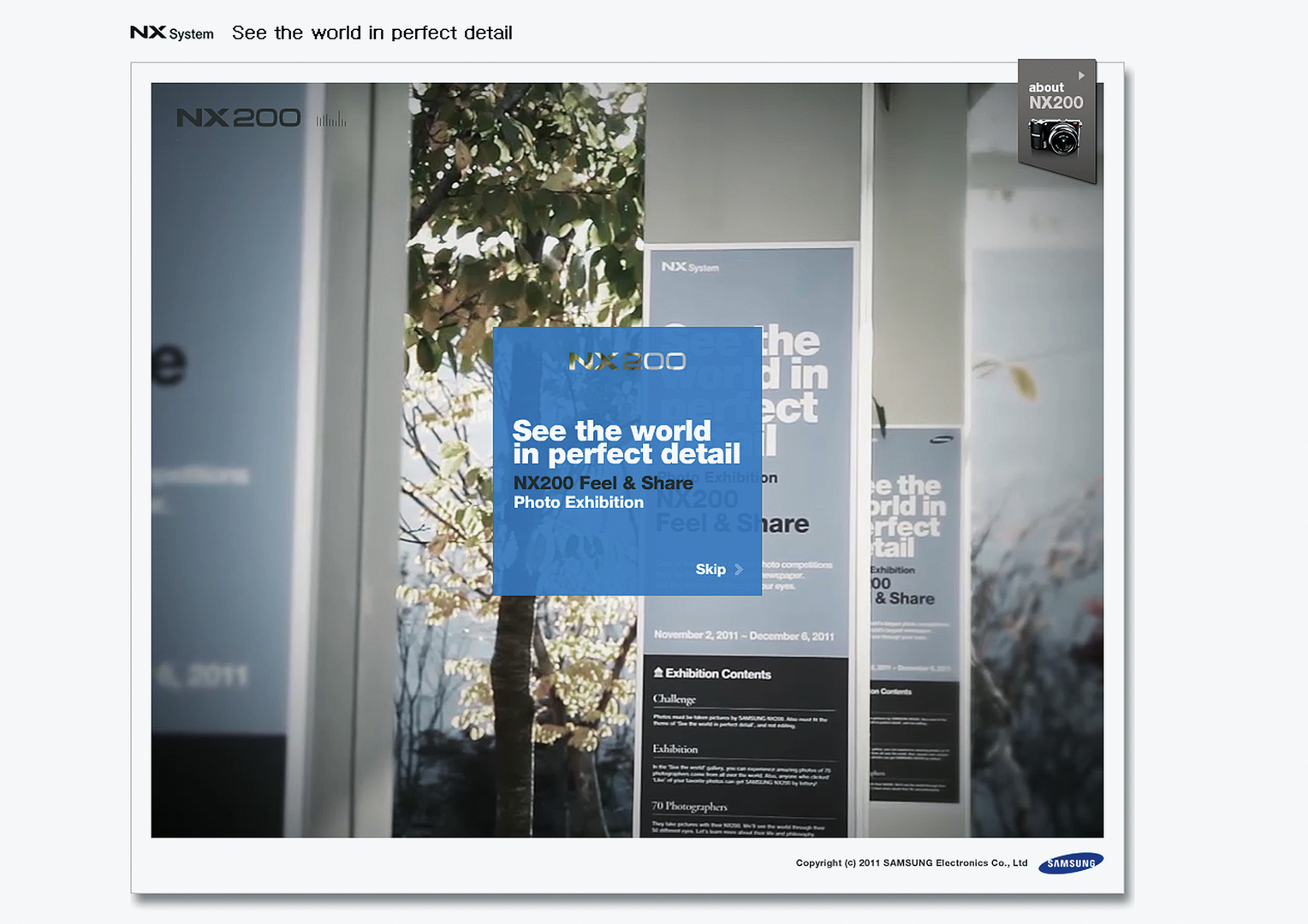 As part of this Facebook campaign, 60 photographers worldwide were invited to take photos with the Samsung NX200 compact system camera. With these photos, they documented their skills, their personal environments as well as their individual photography styles. The photographs were then compiled into a three-dimensional NX200 photo gallery in which users, after choosing their continent, can view and move the images by clicking the mouse. The campaign also offers users the possibility of becoming jurors – voting for and commenting on their favourite shots and sharing them as postcards.