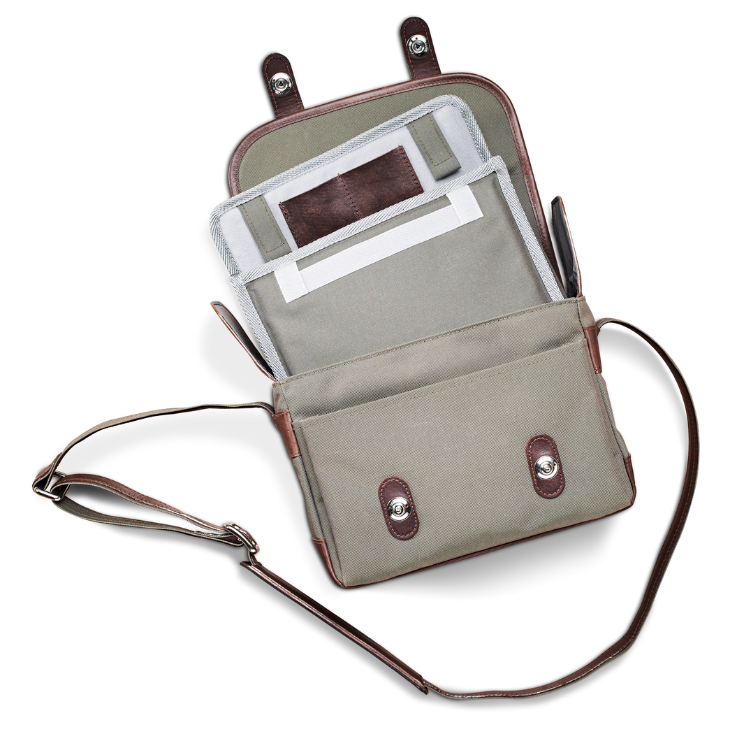 The principal components of this hand-made camera bag – Cordura fabric and tanned cow-hide – make it light and give it a durable shape. A separate insert can be taken out to change the bag’s use while an additional rivet on the strap reduces tugging and, prevents it from fraying. As fasteners the bag uses a special secure fastening solution developed by the automotive industry in the 1960s, thereby preventing unintentional opening of the bag.