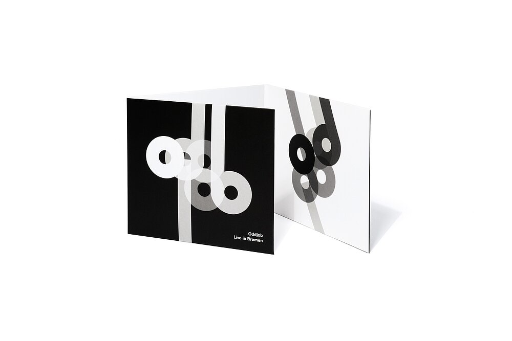 The cover design of the album “Live in Bremen” by the Swedish jazz band Oddjob was inspired by musical improvisation. The graphic-oriented artwork functions as an expression of jazz improvisation, in allusion to the band’s logo. The letters of the band name resemble a sequence of notes, floating into each other and apart again. This creates a rhythmical picture with a three-dimensional effect. The gradients indicate the spatial sound of sophisticated concert recordings. The black-and-white contrast is complemented by subtle grey shading to foster visual unity.