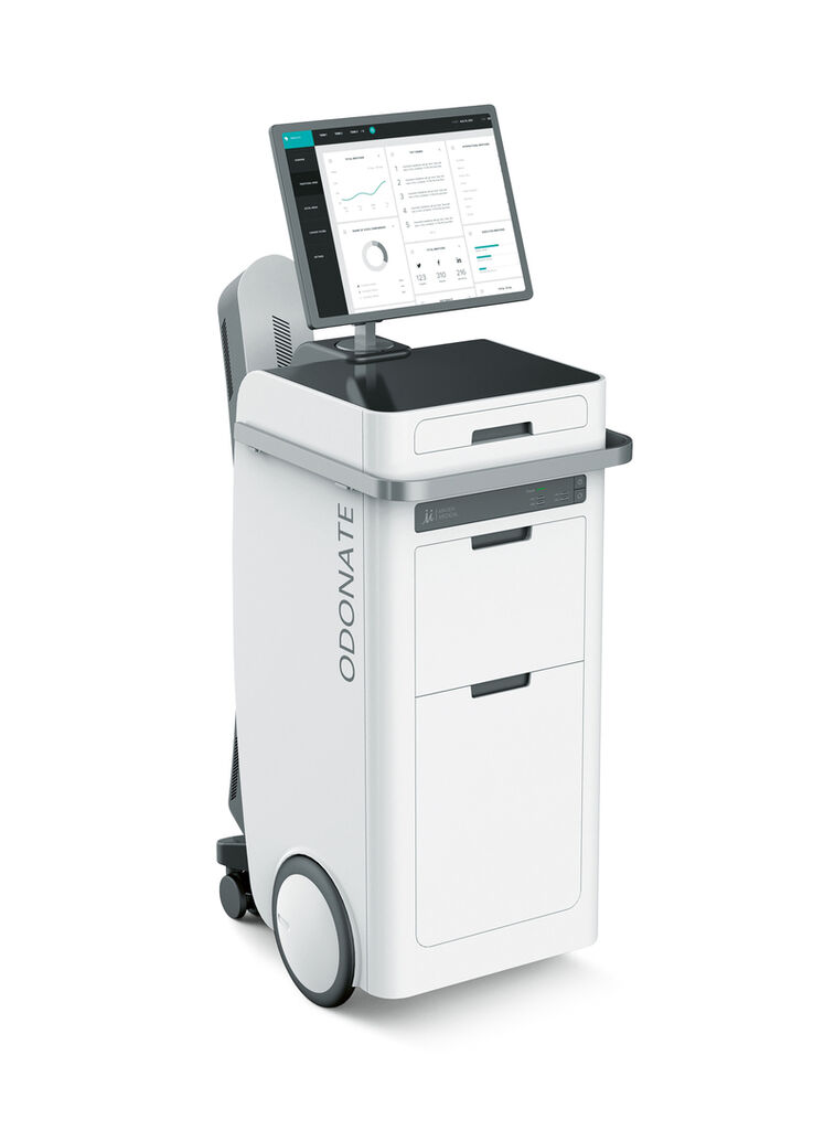 Thanks to its mobile and compact design, this system for motion capture and gait analysis can be used in any interior space where the subject can cover a pace of two meters. In addition, the AI technology eliminates the need to wear special clothing and electrodes. The two depth cameras are integrated into a single C-arm, and the geometric interplay of the curved rear wall and the C-arm sets an elegant design accent.