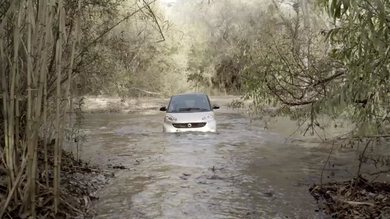 Visualising weakness in a humorous way, this TV spot emphasises the advantages of the smart fortwo as a car that was made for the city. First, the smart fortwo is challenged by desert-like terrain and fails miserably. But the next scene shows it in a city, where it effortlessly drives into a tiny parking space. The sound design underscores the bold manoeuvres through the dramatic rise and fall of powerful music. This tension-building acoustic atmosphere is intensified by individual sounds, such as the rippling of water.