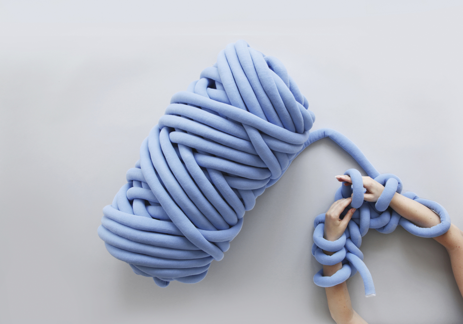 Ohhio Braid is the culmination of a year-long development of the perfect chunky knitting material. it is light, soft, stretchy, holds its form well, and can be cleaned in a washing machine. It has two parts: the shell and its filling. The shell consists of cotton with an injection of polyamide and elastane that makes it both stretchy, pliable. This ensures it does not bunch up and crease when bent. The filling is siliconised micro hollow fibre – a common synthetic pillow stuffing. It dries quickly and allows the material to hold whatever shape it is crafted into.