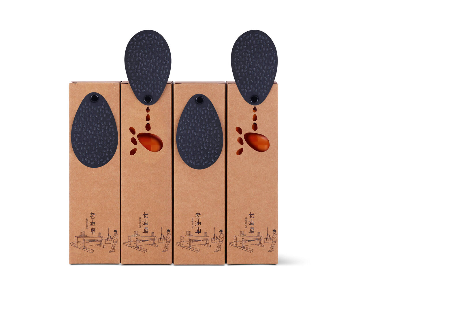 This box for sesame seed oil stands out at the point of sale mostly due to a fold-out in the shape of a black sesame seed, which has been magnified 200-fold. It can be rotated upward by 180 degrees, which brings into view a die-cut shape contoured as the Chinese character for oil. Furthermore, the outer packaging features a drawing that illustrates the traditional process of sesame seed oil production. Both the drawing and the sesame seed stand out from the light-brown box due to the strong colour contrasting. Moreover, the bottle with its paper and cord bottle cap conveys an artisanal character.