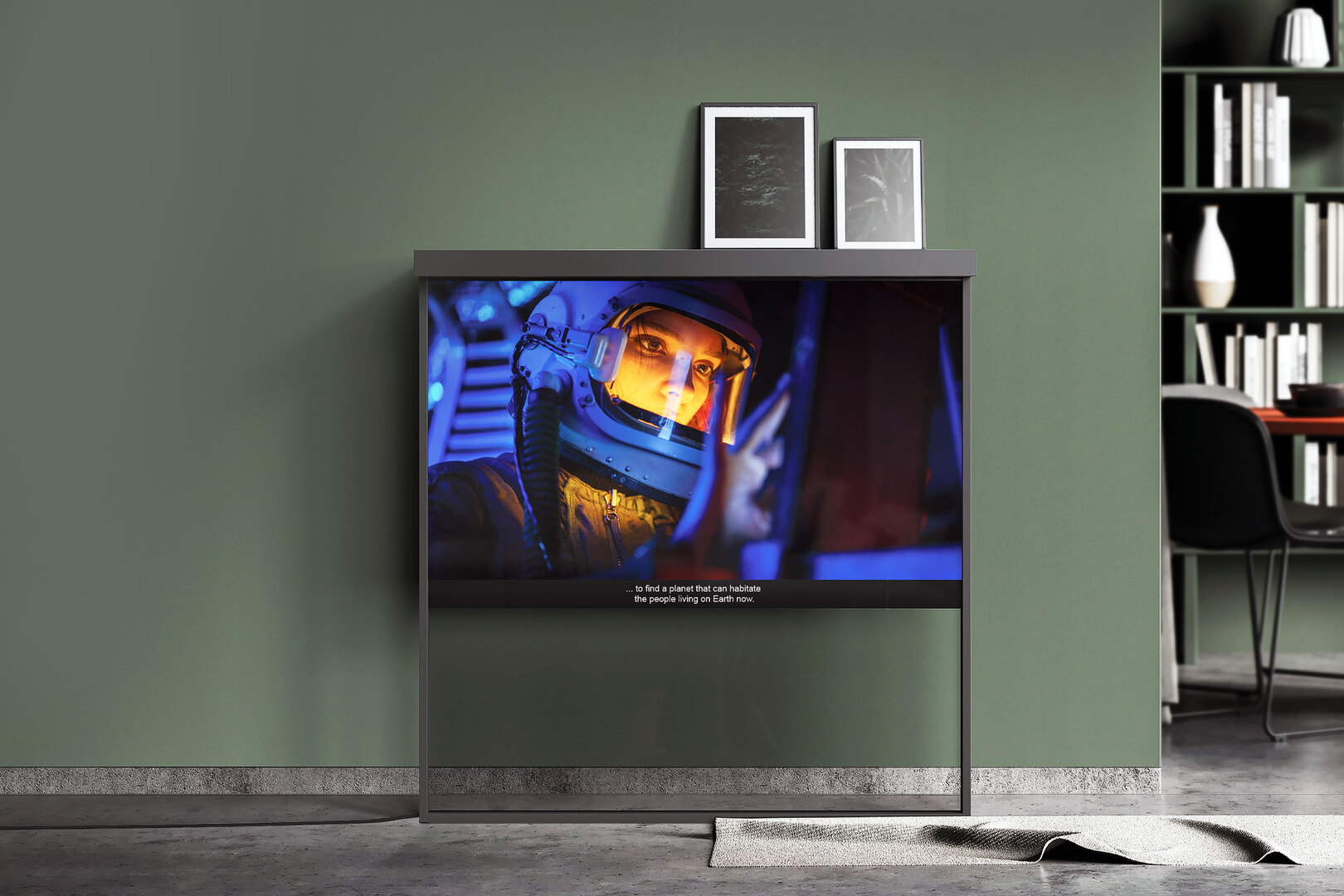 OLED Shelf is a flexible and adjustable home display with a clean square format frame. When not in use, the minimalistic shelf becomes almost fully transparent. Instead, the frame can be used to create a softly illuminated ambience in the room. If desired, a black rollable shutter allows the display screen to be resized or concealed. Surround-sound speakers are also hidden beneath the frame, and the shelf doubles as an inductive phone charger.