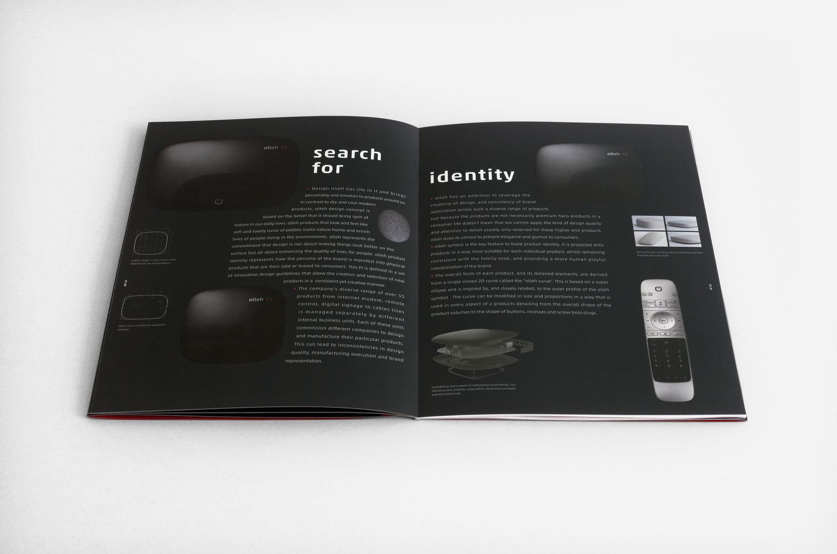 Designed to present the product identity and product design concept of the olleh IT service brand, the key characteristic of this brochure is the “olleh curve” – the curved outer line incorporated in all company products. This distinguishing feature is already used on the cover in the form of a blind stamp, providing an experience that is both haptic and visual. In order to effectively highlight its key significance, all individual products are first printed on transparent paper and then superimposed. Finally, the latter section of the brochure touches upon the service provider’s ecological awareness: all previously discarded packaging is now being reused for the storage of cables.