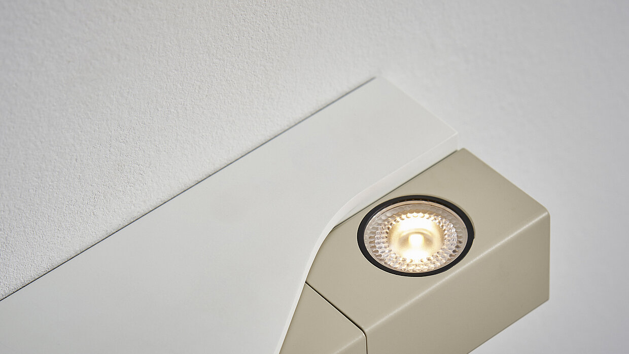 Thanks to its innovative lampshade, OLO Ø delivers glare-free LED lighting. Its contour effectively guides the direct light component to the front, while a rotatable joint allows precise alignments of the lampshade. A circular opening at the back of the lampshade allows for discreet light diffusion to the back, reducing the contrast between the directly illuminated and darker areas of the room. The frame is highly compact, making the lamp easy to transport.