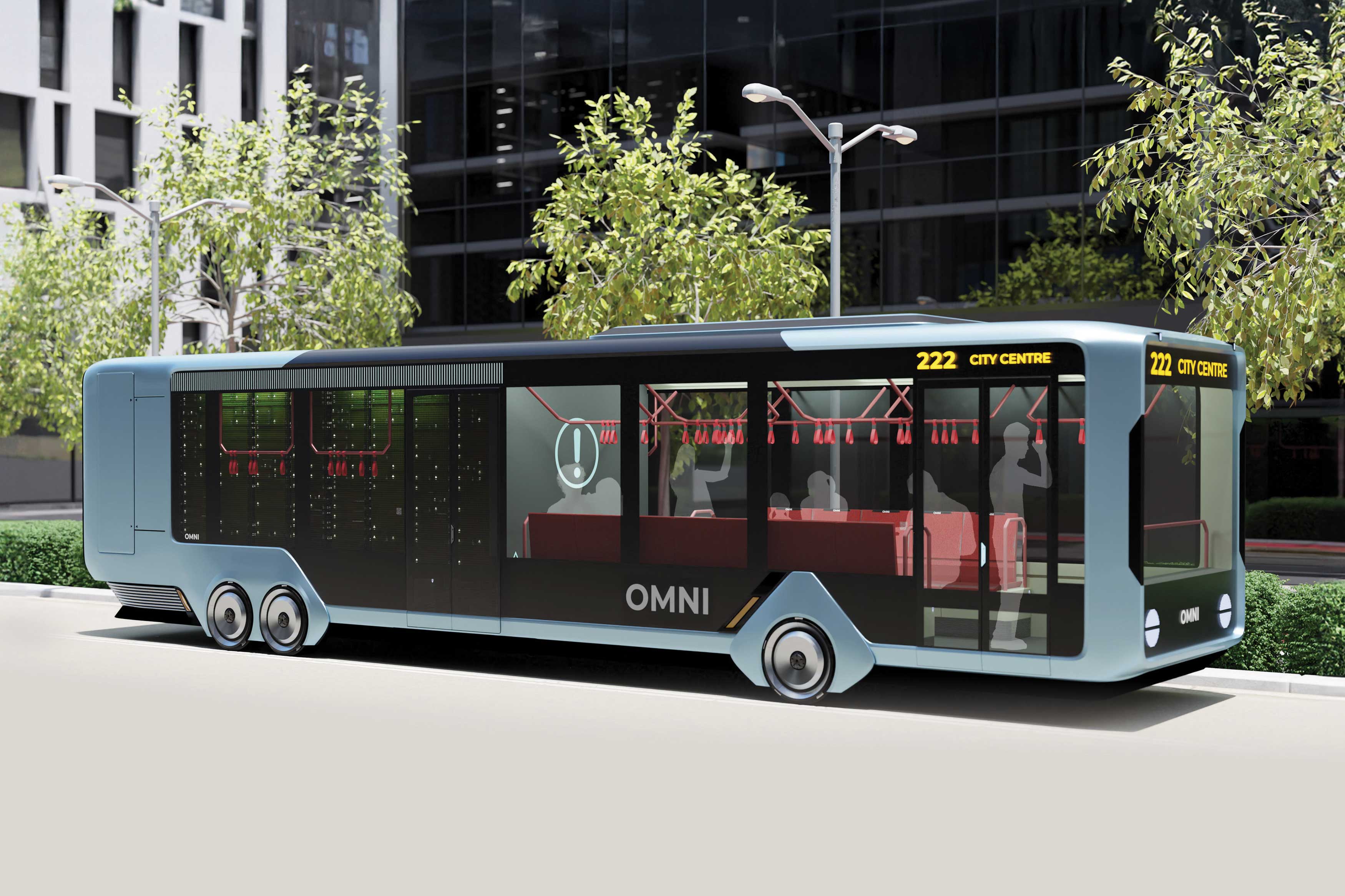 During off-peak hours, OMNI buses efficiently convert idle capacity, shifting interiors with minimal downtime to create space for cargo platforms. The delivery goods arrive in multi-use hard-shell boxes that circulate within the system. Order requests and drop-offs are made at dedicated, well-marked bus stops. Once the goods are retrieved, the boxes containing them continue their journey in the circular system. Red Dot Award: Design Concept | Red Dot: Next Gen Award | Concept | Commercial Vehicles