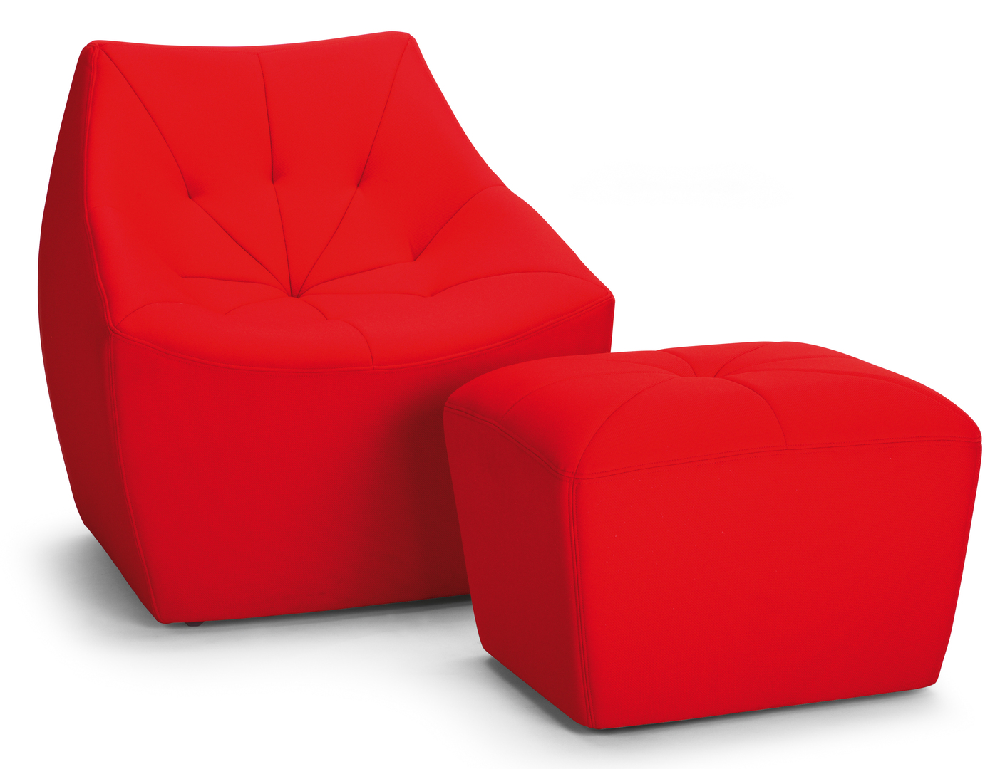 This comfortable memory foam furniture combination of an armchair and an ottoman is manufactured using an innovative method: instead of a heavy wood or steel frame, a solid foam core provides stability. The gentle contours are achieved by filling polyurethane foam into a curved mould. The snugness of the material stimulates the relaxation of the entire body. Both chair and ottoman are upholstered in a fabric that snugly fits around the elastic foam material.