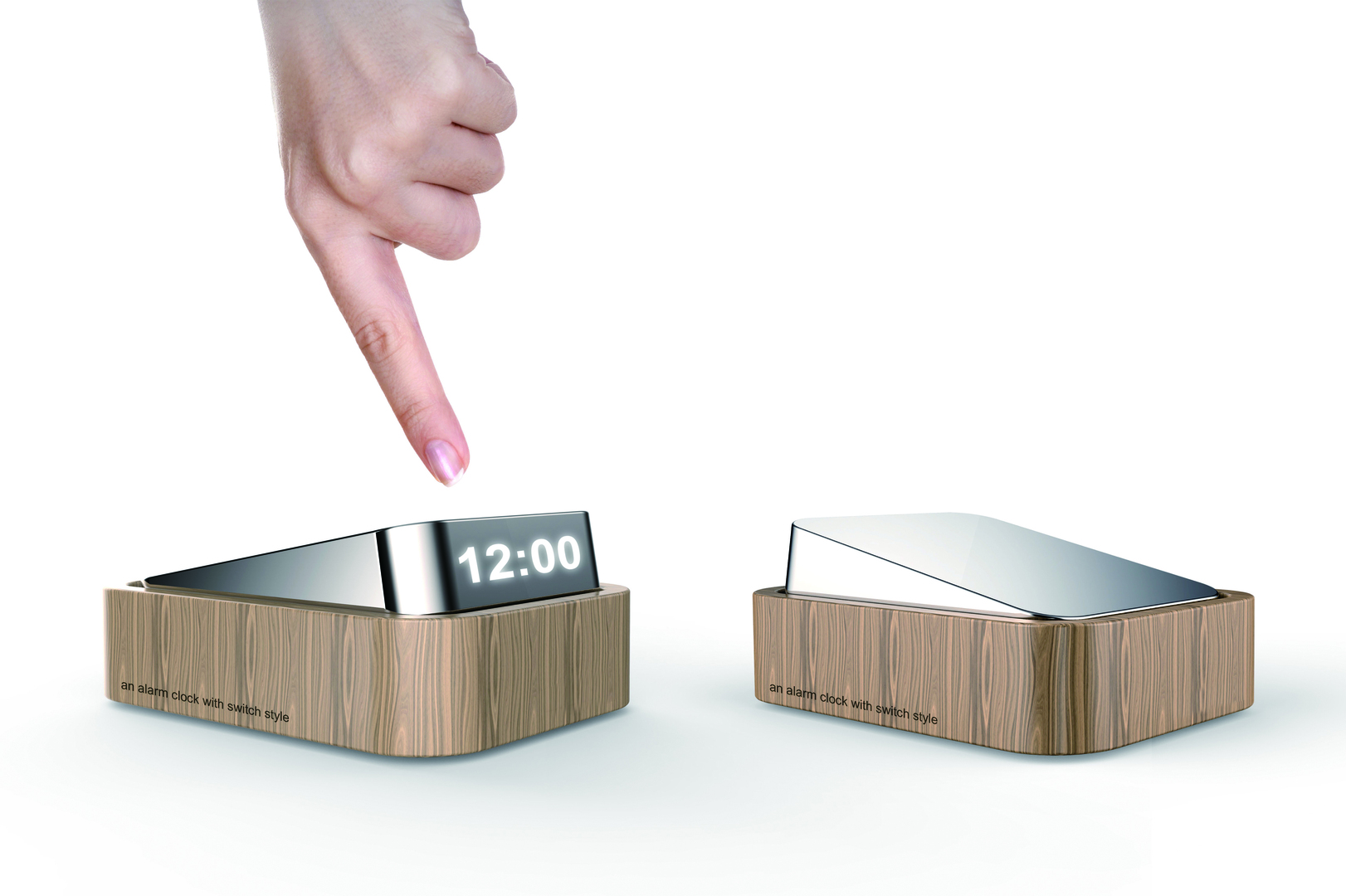 On/Off Alarm Clock is designed to resemble the square form of a contemporary push-button switch. It has two major functions: regular clock and night-light. Pressing down one side of the “switch” reveals a digital clock function. To turn off the alarm, simply press down against the side of clock display area. This reveals the light functions on the other side of the clock’s body.
