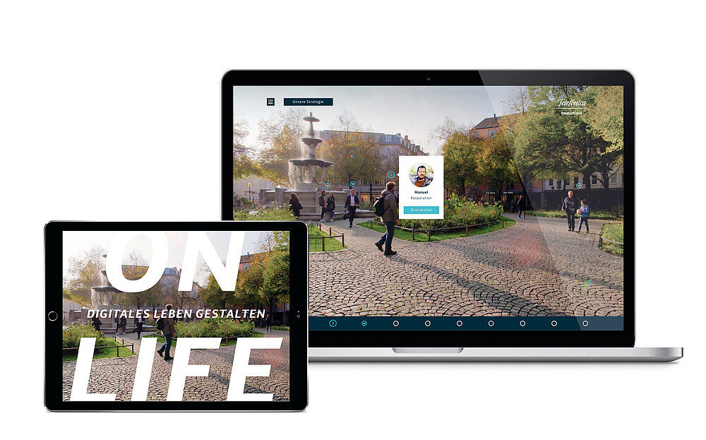 With the 2016 online annual report, Telefónica Deutschland positions itself right where it needs to be as an “OnLife Telco” – in the digital everyday life of society. The starting point and heart of the online magazine is a video of a public place. In this video, the user encounters 14 protagonists in total living their daily lives, doing their work and contemplating their ideas. Telefónica Deutschland provides answers to customers’ questions and, in addition, provides insight into the fiscal year 2016. The website accompanying the annual report contains multimedia elements such as videos, images and digital features. Via links on the sub-pages, the visitor receives additional information about the company.