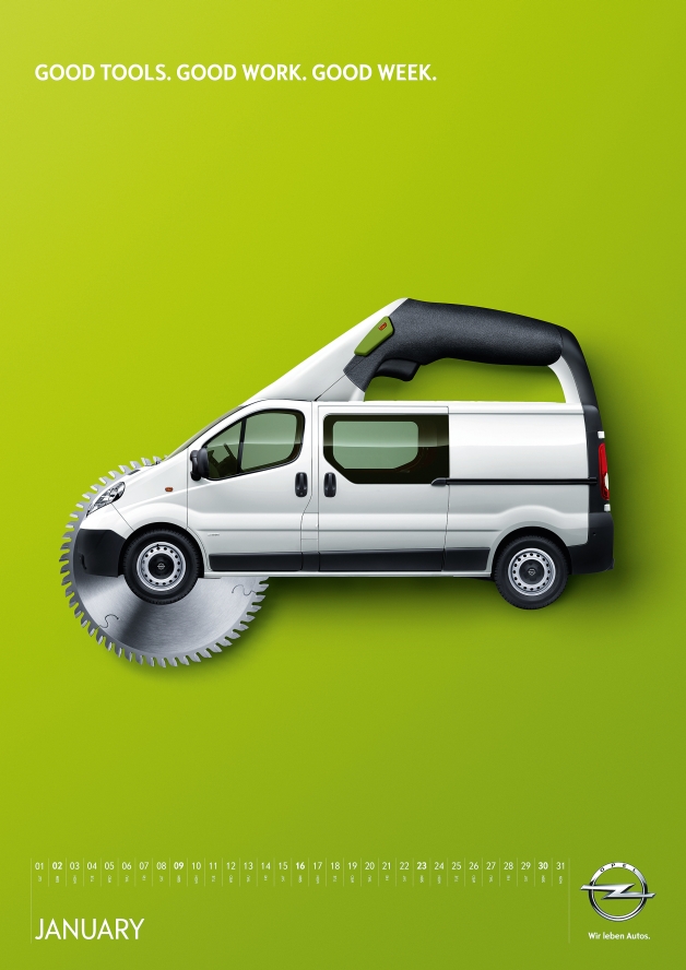 The idea behind the motifs of this calendar was to showcase Opel’s commercial vehicles with an emotionally appealing design that integrates the entire product range. The different target groups are individually addressed by connecting the vehicles to work equipment. Cars and tools form a harmonious combination in this image series, appealing to customers without alienating the actually promoted product.